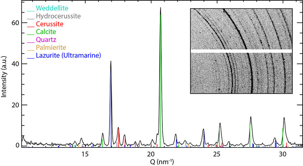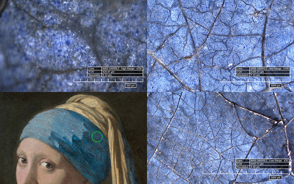 The shadow of the headscarf above her ear looks different now than it did when Vermeer painted it. The extent of possible degradation in the Girl’s headscarf is something we are researching as part of the Girl in the Spotlight project. Using the 3D digital microscope, we can inspect the surface in areas that seem to have degraded. With MA-XRPD we will learn more about the crystalline structure of the pigment, and how it has changed over time. Degradation of paint layers leads to new chemical compounds being formed on or close to the paint surface, altering its appearance. In the dark blue, MA-XRPD detected small amounts of two of these compounds: palmierite and weddellite.