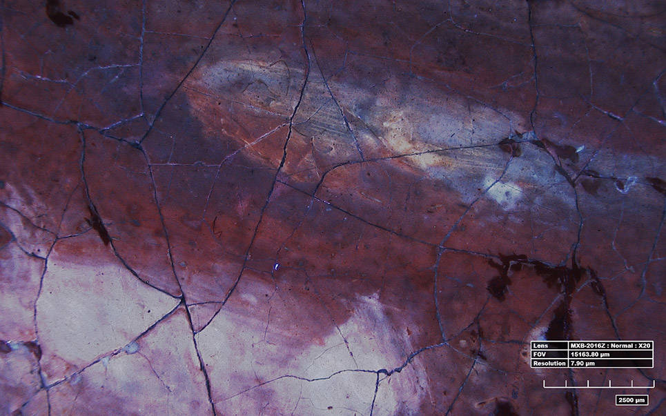 On top of an underlayer of vermilion, Vermeer applied a layer of translucent red lake to the Girl’s lips. Under the Hirox 3d microscope, the glaze that extends slightly over her teeth appears pinkish, and some red lake is also mixed into the highlight on her lip in UV. The glaze is visible in the fluorescence false-colour image taken by the researchers from the National Gallery of Art, Washington.