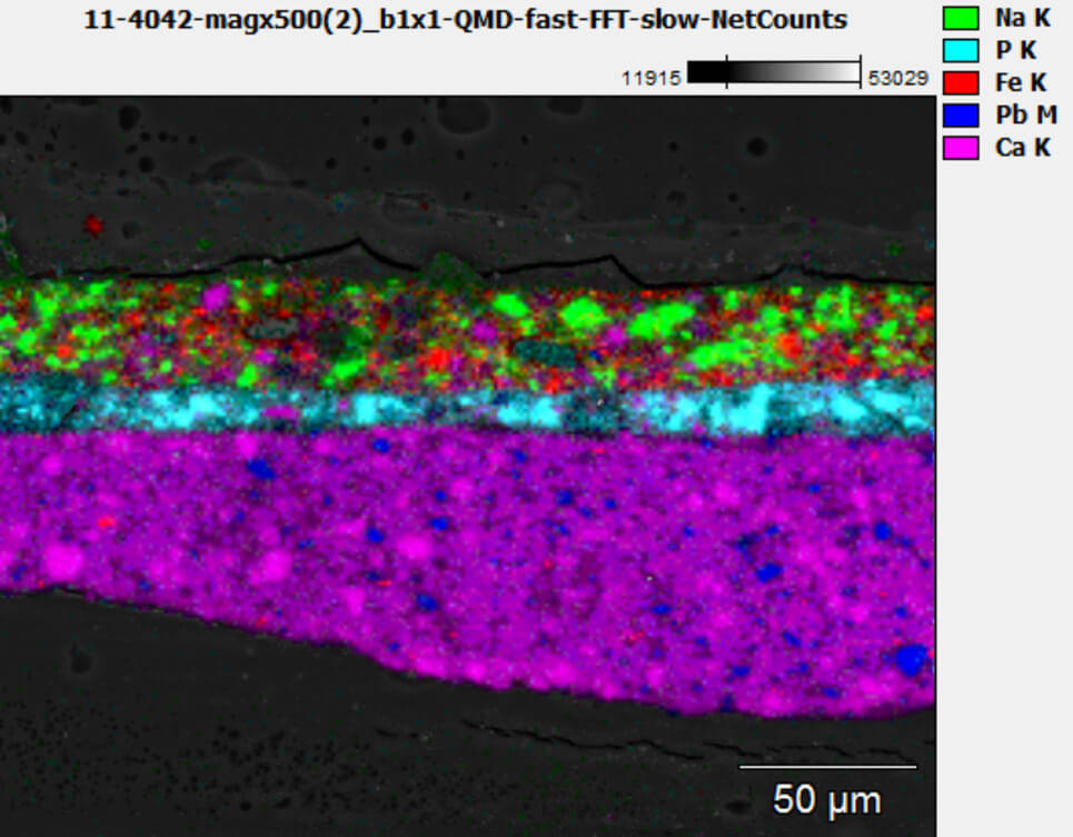 FIB-TEM can magnify up to one million times. In this study it was used to examine cross-sections at extremely high magnifications and differentiate the black pigments. The sample is prepared with the Focused Ion Beam (FIB) then the elements are mapped and analysed with transmission electron microscopy (TEM).