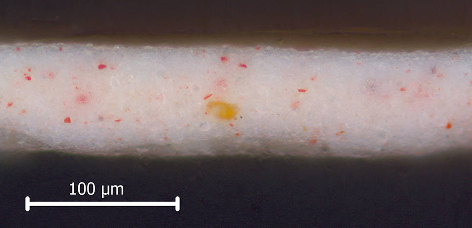 In cross-sections from the Girl, red lake is sometimes visible as particles that appear deep red in normal light, and fluoresce bright pink in UV. Because red lake fades over time, it is harder to see some of the particles. Calcium from the substrate can be detected using SEM-EDX. Paint fragments from the Girl’s skin and clothing were examined with the chromatographic technique UHPLC. They were found to contain carmine, most likely made from Mexican cochineal.