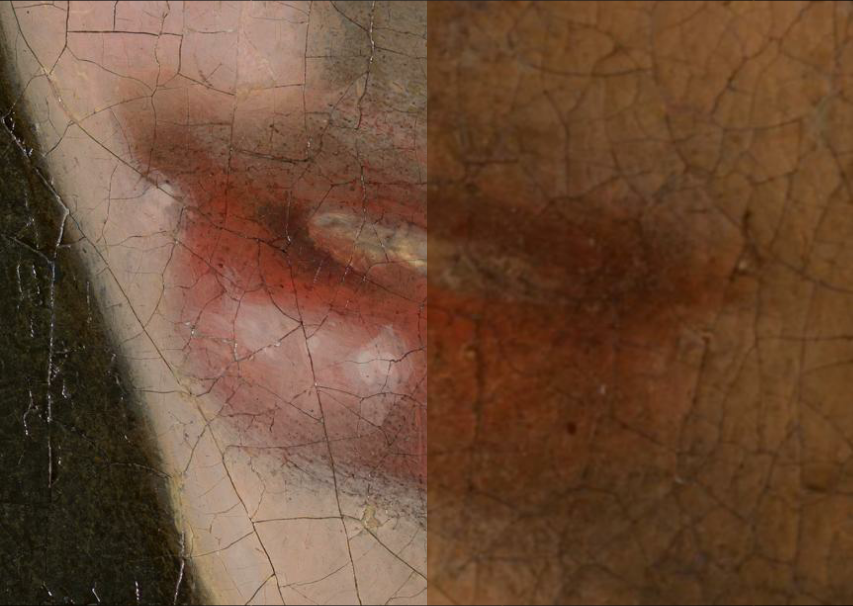 The most infamous of these dislodged fragments is the ‘second highlight’ on The Girl’s pearl earring. Until the 1994 treatment, people thought that the pearl had two bright white highlights: one large teardrop shape and higher up on the earring, and the other smaller one lower down. It turns out that the smaller one wasn’t a highlight after all.
