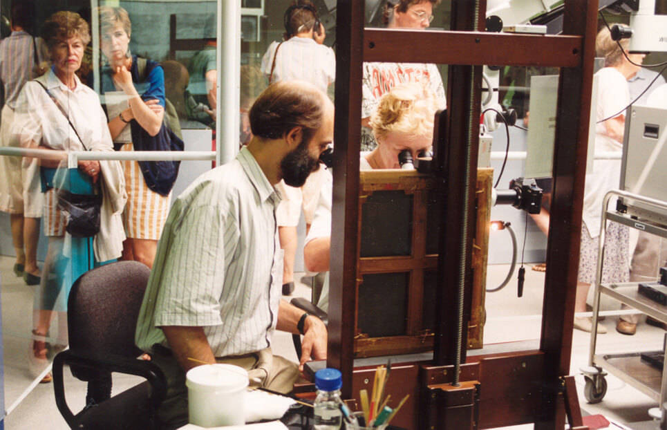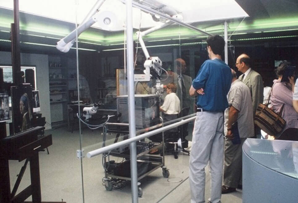 In preparation for the blockbuster Vermeer exhibition at the Mauritshuis in 1996, The Girl was restored alongside Vermeer’s View of Delft. The 1994 conservation and research project was called Vermeer Illuminated, and happened in front of the public, much like the current project. The conservators worked in a temporary studio, and visitors could watch through a glass wall, and from above through a skylight.
