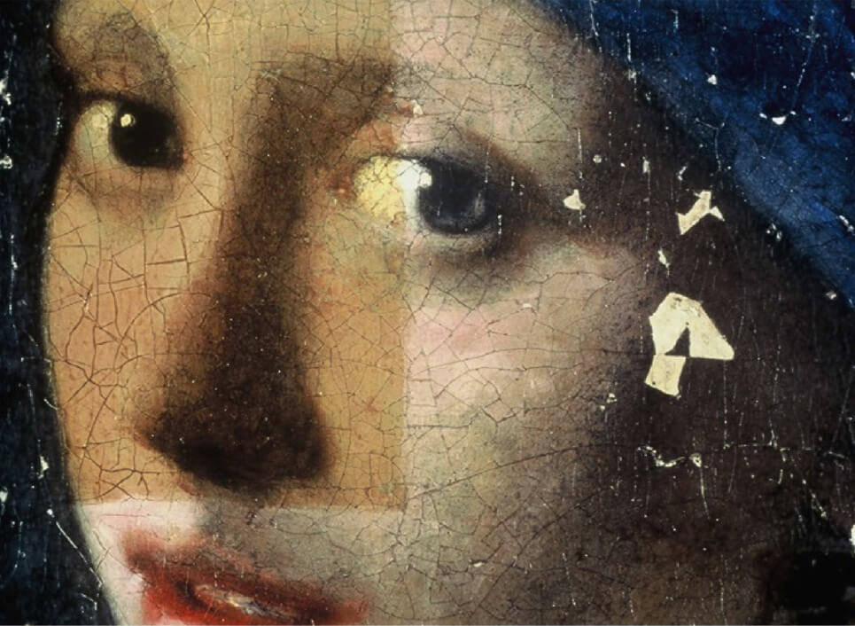 The materials that the conservators used in 1994 used can be easily removed in the future. They will deteriorate more slowly than those used in the past, especially as the climate, lighting and temperature in the museum are designed to be as stable as possible. Some deterioration that occurred naturally as the painting aged – like the fading of the pigments in the background (which I’ll talk about later) – are things we have to accept and that some see as almost a rite of passage: an inevitable part of the ageing process. You can read more about the conservation process in the books Preserving our Heritage, and Vermeer Illuminated.