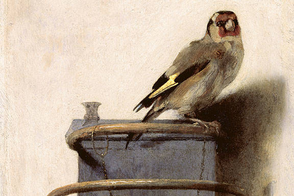 There is also a goldfinch in this painting. This bird is very famous because Carel Fabritius made a painting of it. You can see that particular painting alongside. Can you find the goldfinch in the Garden of Eden?