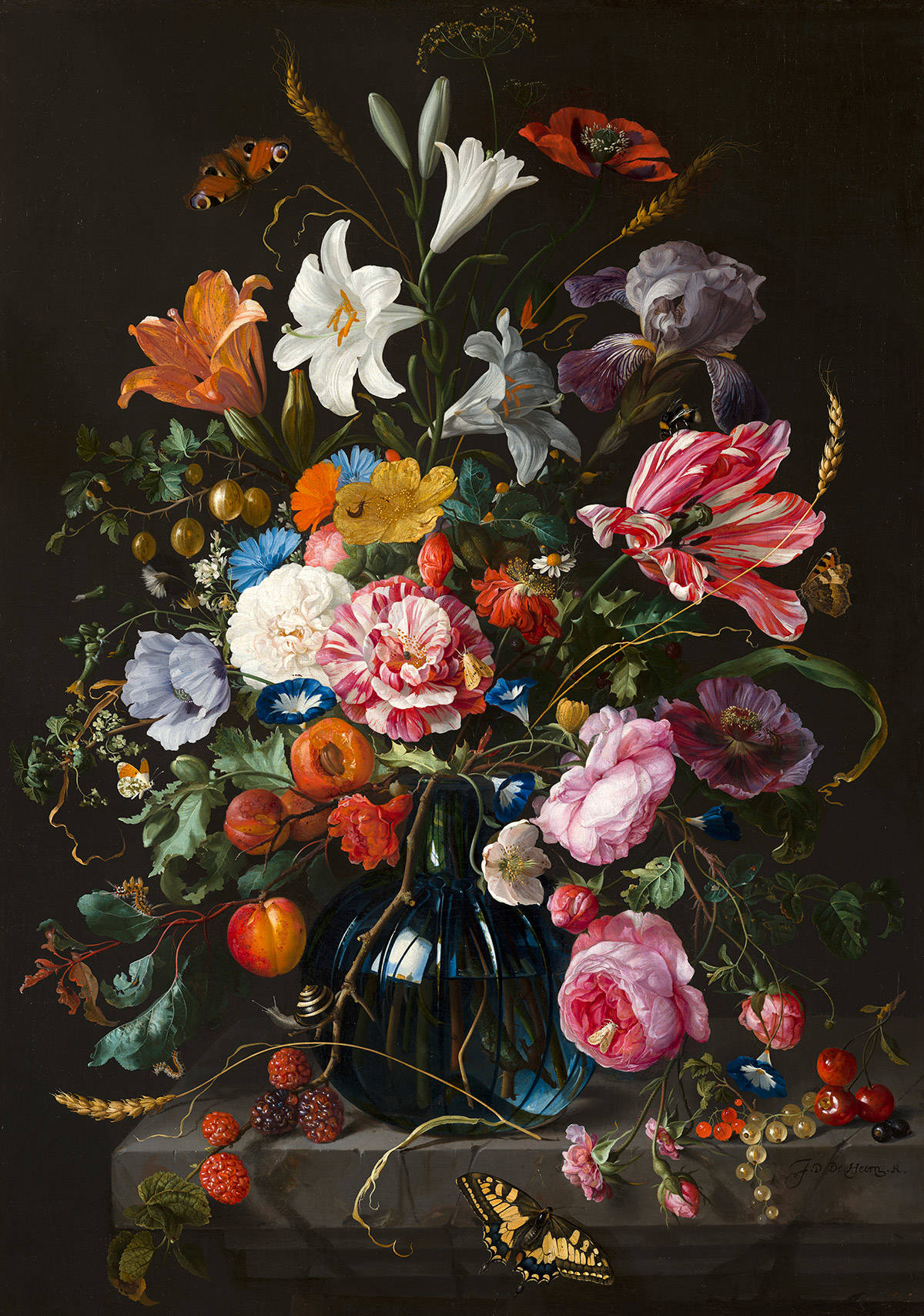 This type of painting we call a flower still life. The flowers are indeed standing still, but if you take a closer look, you'll see all kinds of small insects.