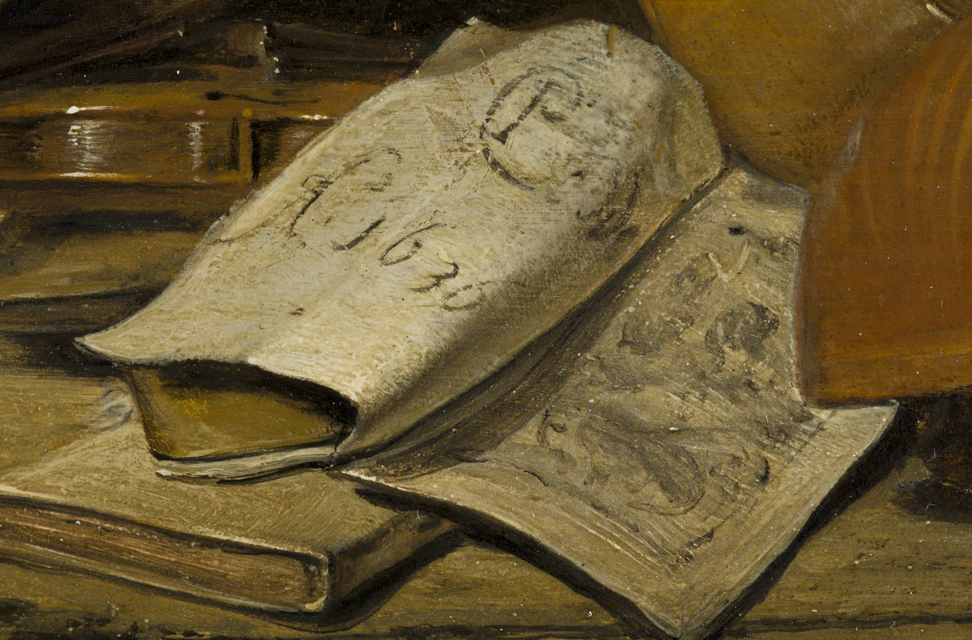 In this merry company, people are eating, drinking and making music. In the middle of the room, a woman in a fashionable black dress is dancing with a man wearing a Venetian mask and a fool’s costume. His two companions on the left are masked as well.