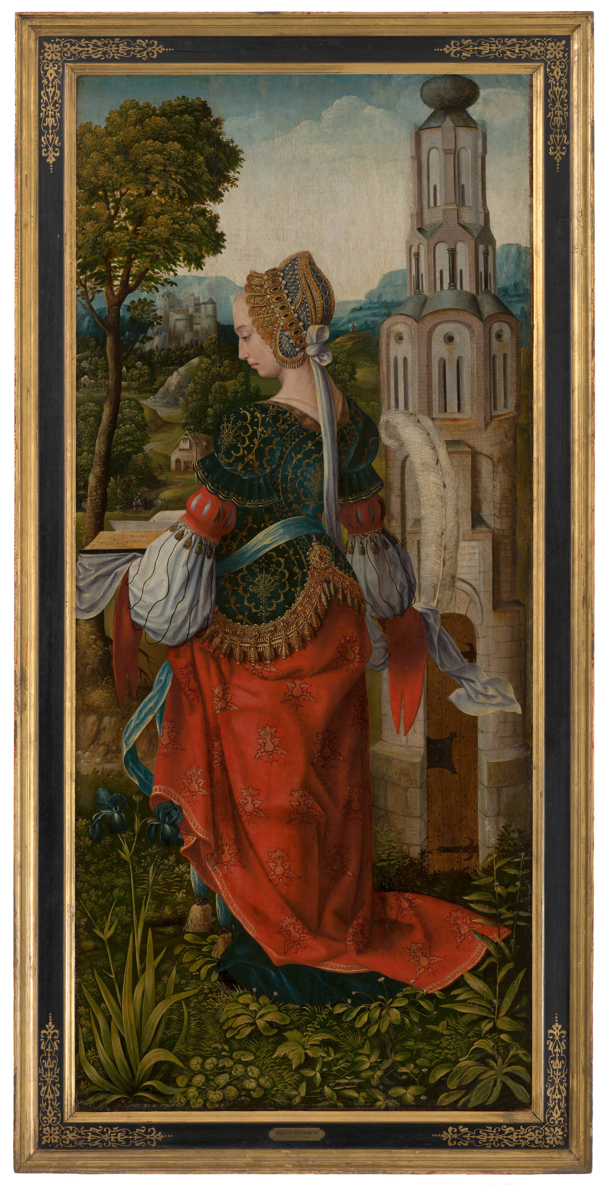 Saint Barbara is recognisable by the tower where her father had her locked away after she converted to Christianity. Barbara wears colourful clothing embellished with gold embroidery and magnificent jewels. In her hand she holds an ostrich feather given to her by the Christ Child in a vision.