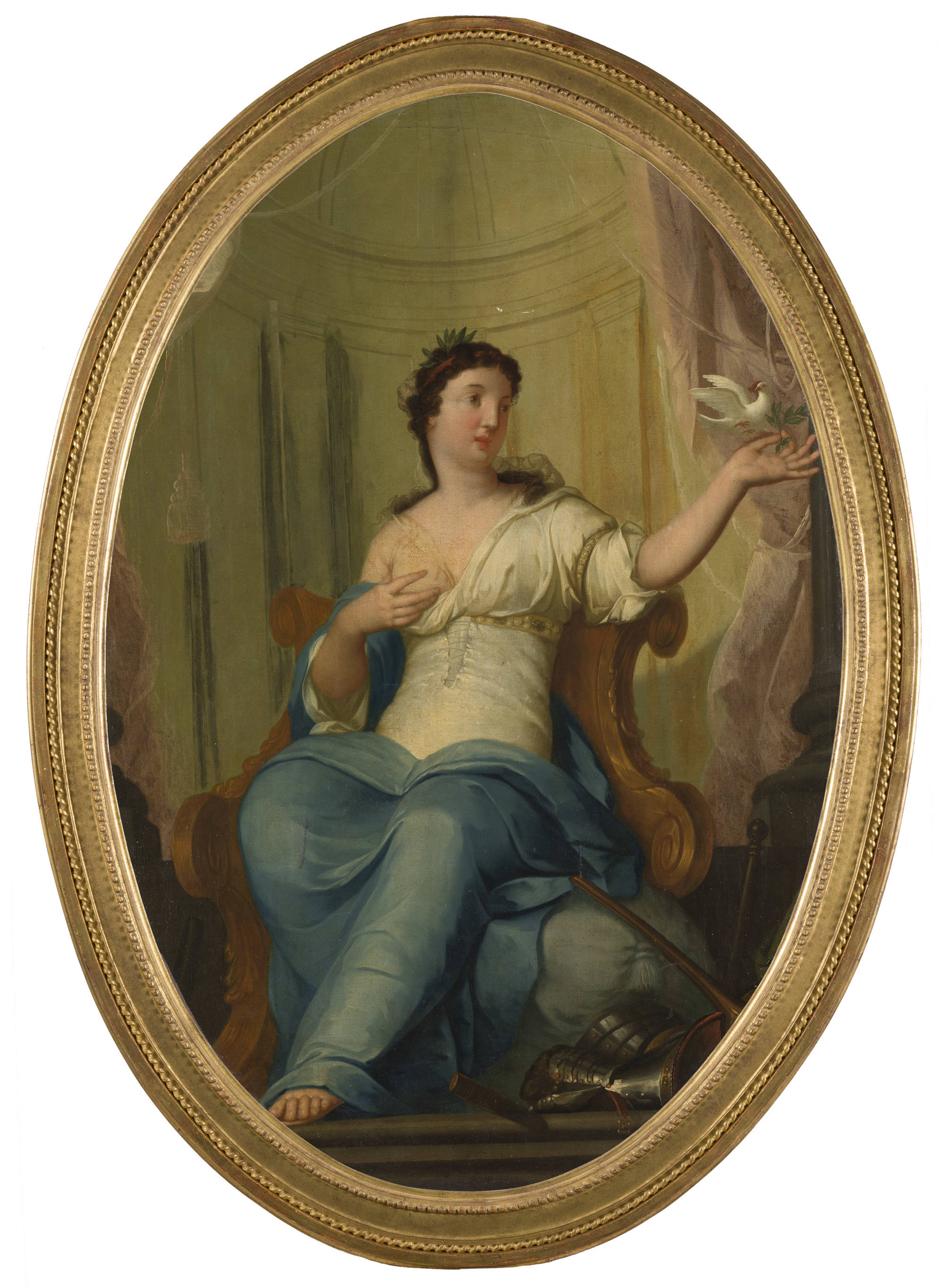 The lady sitting here on her throne represents Peace. A suit of armour lies unused at her feet, and she is holding a palm branch, while a white dove of peace is fluttering up into the air.