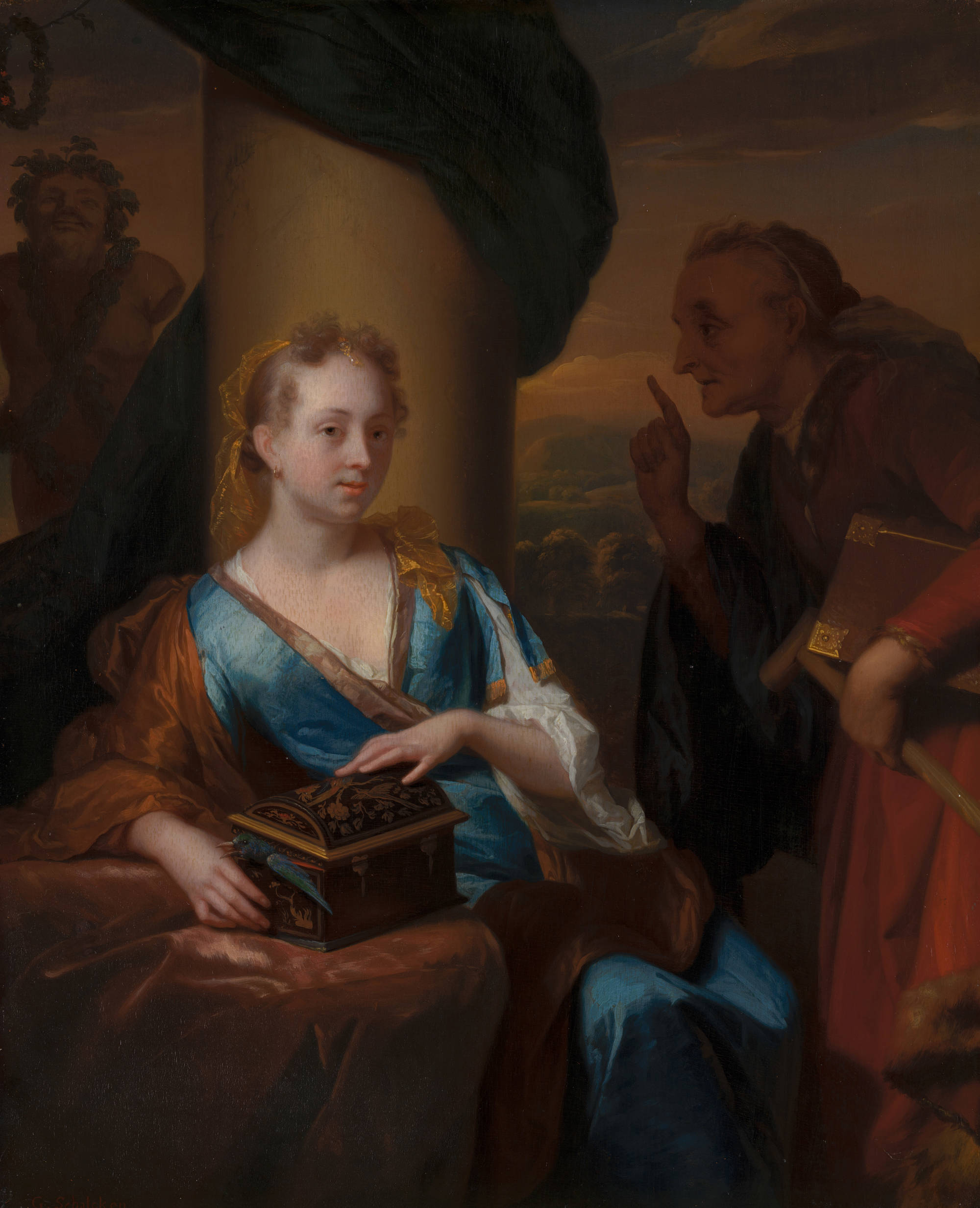 The meaning of this scene by the ‘fijnschilder’, or fine painter, Schalcken would have been immediately clear to seventeenth-century viewers. It concerns the lesson being given to the young, fashionable woman, while she almost lets the little bird escape from its cage. The bird is symbolic of her virginity. The old woman standing beside her is raising her finger in warning and cautioning her against the dangers of love. But her lesson is useless – the young virgin is hardly listening.