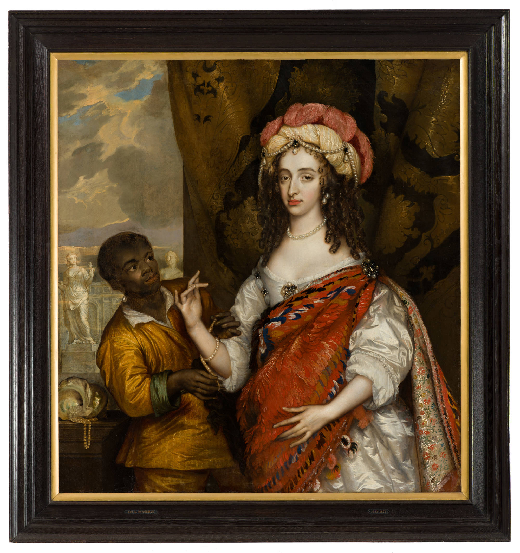 Mary is ready for a fancy-dress ball and wears a white dress, an ostrich feather turban and a Brazilian feathered cloak. Her servant is fastening a string of pearls, but Mary seems not to notice him. The black boy is reduced to an ‘exotic’ accessory, with which Hanneman emphasizes Mary’s white skin and elevated position.