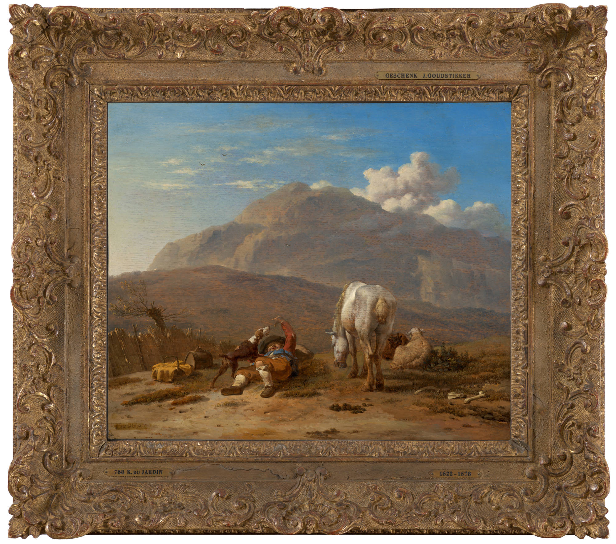 Du Jardin, who made several journeys to Italy, has made the Mediterranean heat of this Italian landscape almost tangible. The shepherd boy lies languidly playing with his dog. He is taking a break, as his horse is grazing peacefully and his provisions are ready to eat.