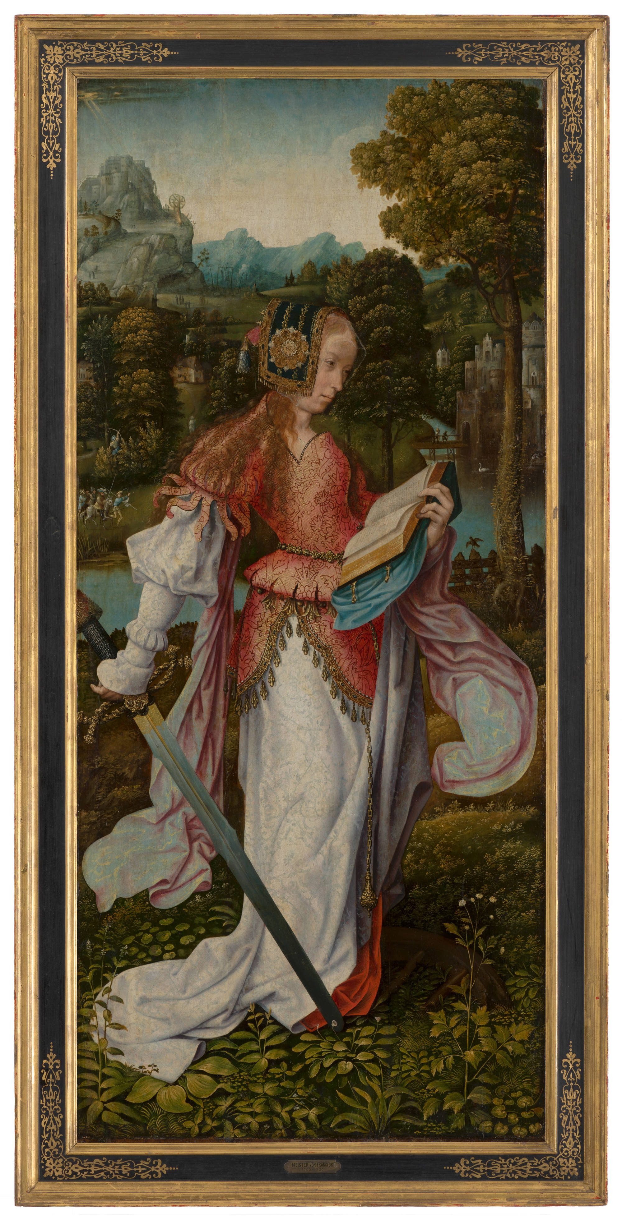 Catherine of Alexandria was one of the most popular female saints in the late Middle Ages. She is recognisable by her instruments of torture: the sword and wheel that lies broken at her feet. Here Catharine wears a magnificent gown that has been painted in meticulous detail. Equally detailed is the depiction of the surrounding countryside.