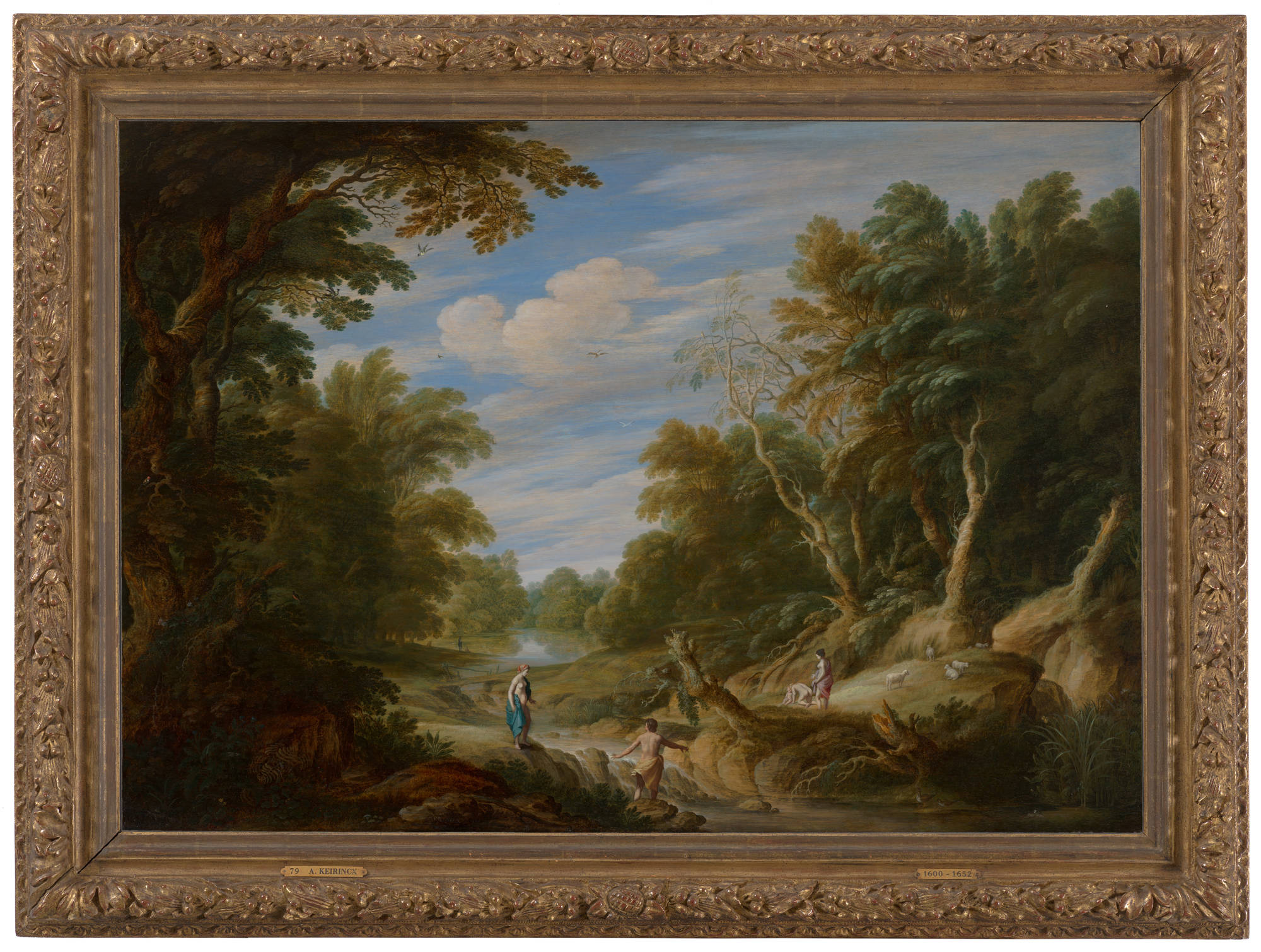 In an idyllic landscape with trees, a stream and a pool, some bathers have gathered by a small waterfall. The landscape is by the Antwerp painter Alexander Keirincx, a pupil of the landscape painter Abraham Govaerts. Keirincx did not paint the figures in the landscape himself. They were painted by Cornelis van Poelenburch.