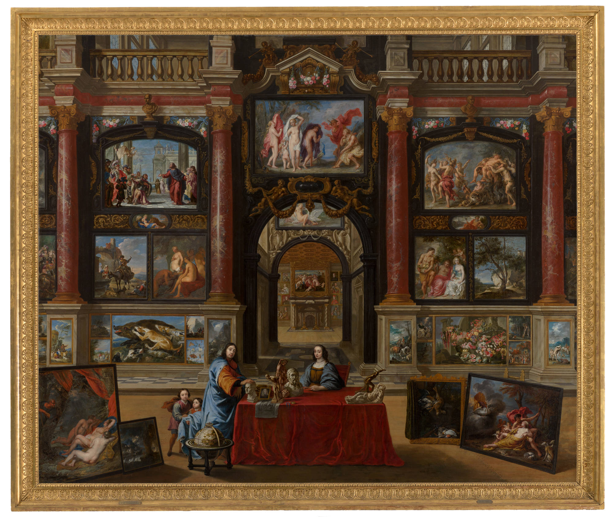 Pictures showing rooms full of paintings and other works of art are known as gallery paintings (kunstkamers). It was a genre that flourished in seventeenth-century Antwerp. This particular gallery painting is unusual since as many as twenty artists worked on it. Each artist contributed one or more of the miniature paintings, co-ordinated by Gonzales Coques, who also painted the figures in the foreground. For a contemporary viewer of a group work like this, it would have been great fun to see who could recognise the most masters.