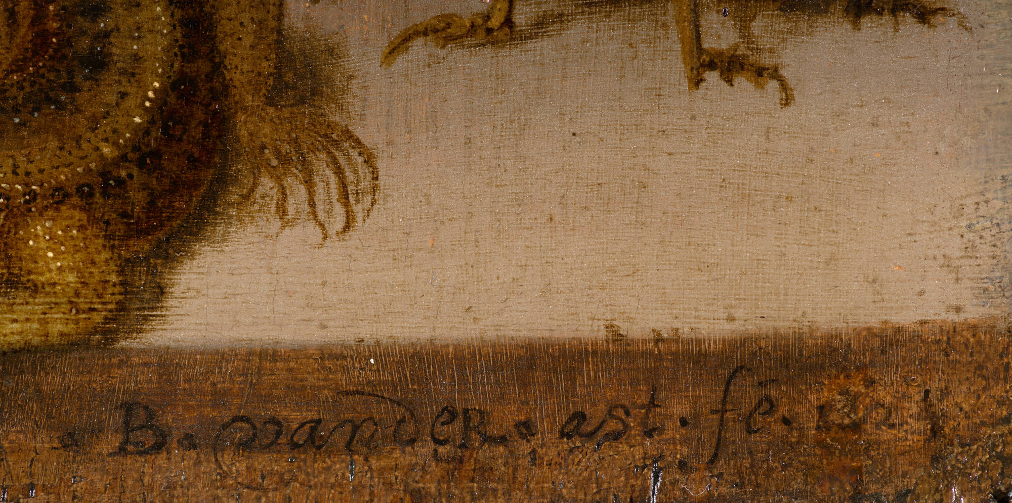 Rare flowers including irises, roses and tulips are arranged in an expensive Chinese porcelain vase with a striking gilded foot. Lying next to the vase are lilies of the valley and forget-me-nots, together with a lizard and grasshopper. Hidden in the bouquet itself is another creature: a daddy longlegs.