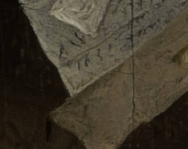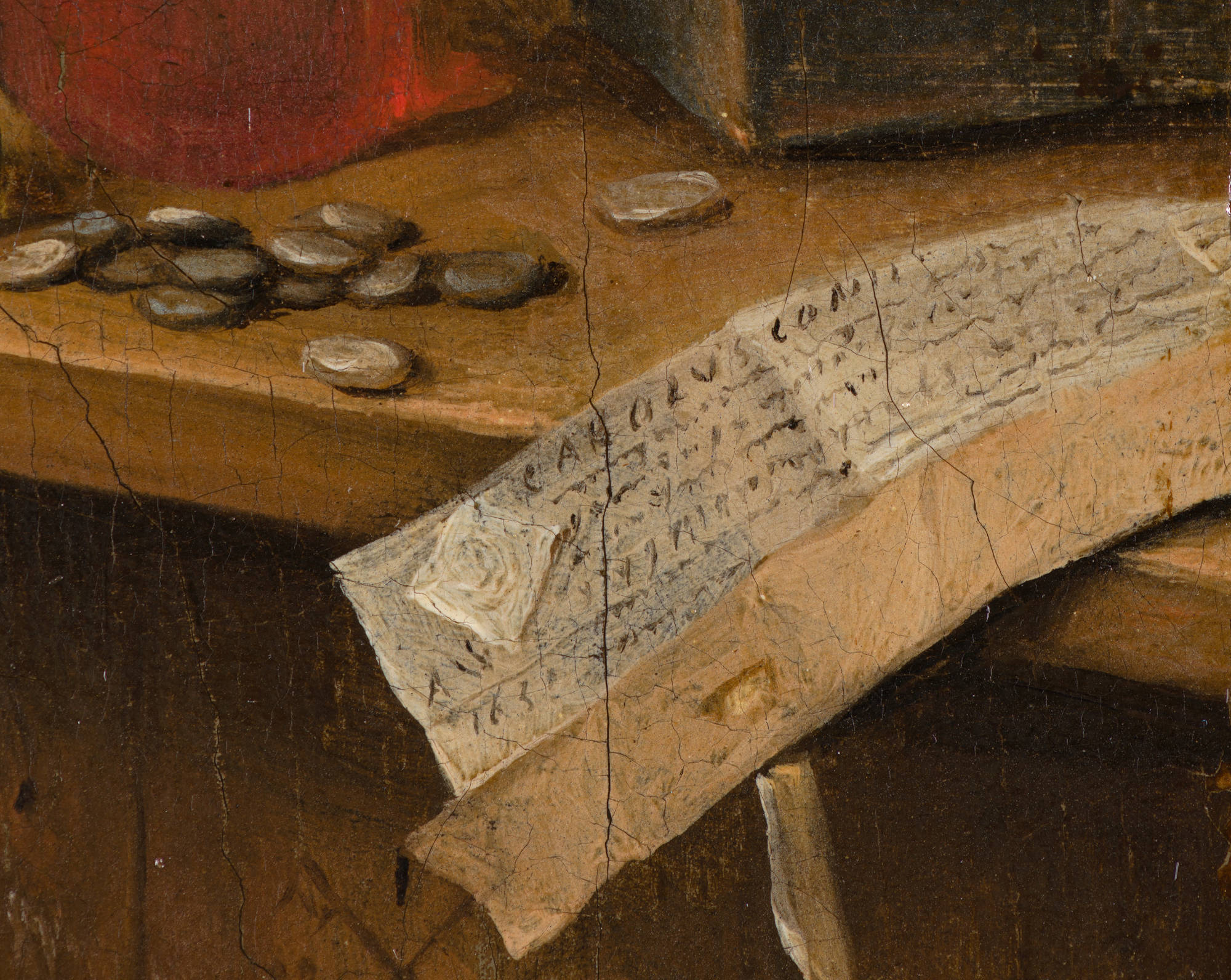 This Tooth-Puller of 1651 provides an important basis for determining the chronology of Steen’s oeuvre. Steen demonstrated his ability to paint in an extremely refined and detailed manner in this early work. He draws attention to such details as the certificate on the table and the face of the young patient at the heart of the composition by working them out carefully with a fine brush. Other passages, such as the figures in the background, are much more sketchily rendered; this method serves to direct the viewer’s gaze to certain details. This varied technique became Steen’s trademark.
