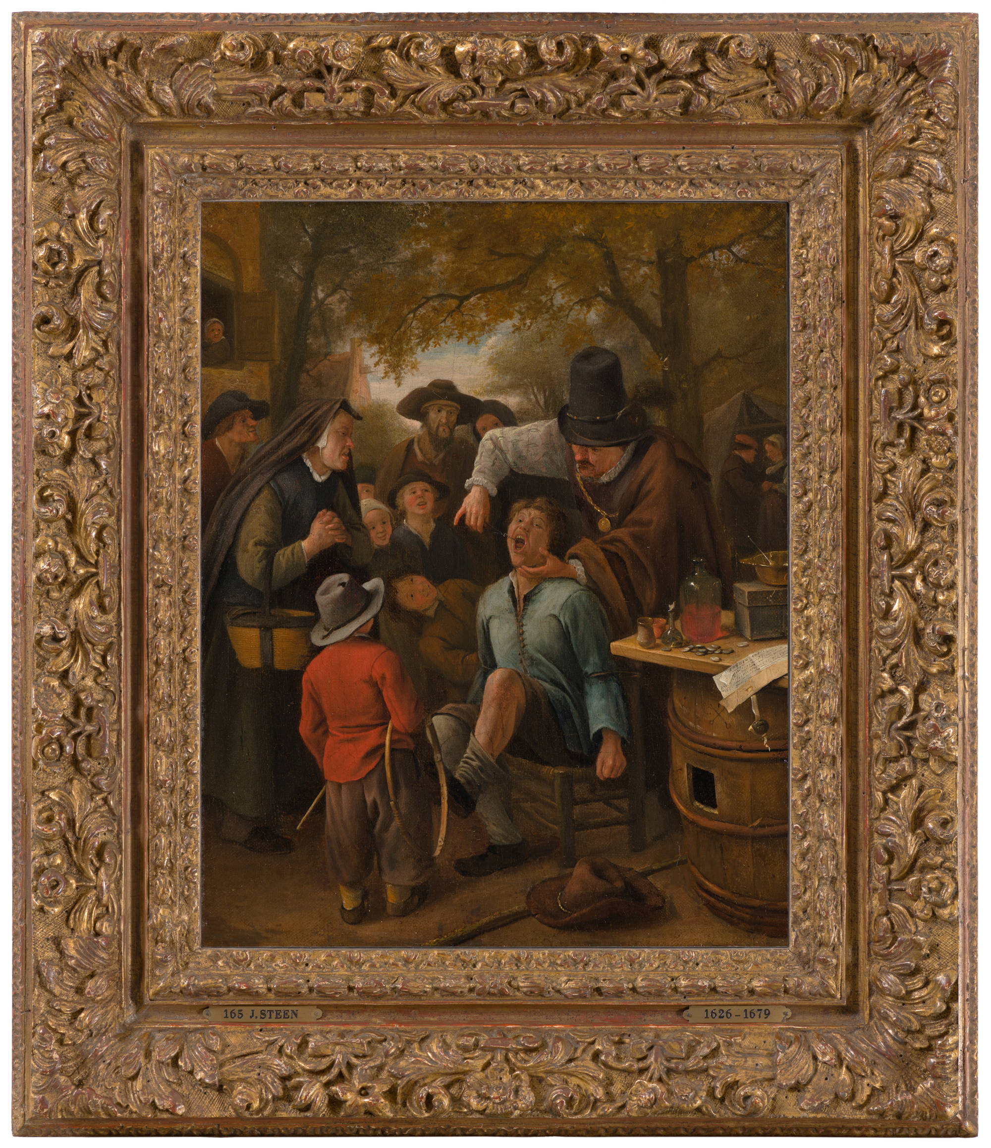 No other seventeenth-century painter could ridicule human vice and folly as ingeniously and effectively as Jan Steen. In this relatively small work, a tooth-puller hoodwinks a gullible patient in front of a crowd of curious onlookers. The profession was held in very low regard at a time when dentistry was practised only by barber-surgeons and itinerant quacksalvers. Dim-witted peasants who let themselves be taken in by such untrustworthy characters were naturally the butt of jokes.1 The subject was clearly a rewarding one for Jan Steen, who seems to have discovered his talent for humour in this early painting. The composition is dated 1651 on the document lying on the table top at right.2 This is the first year from which dated work by Steen is known; on average, he dated one out of every ten works. While his earliest, undated peasant scenes testify to meticulous attention to the landscape setting, The Tooth-Puller is one of the first works in which he concentrated on the rendering of the figures. This particular painting evidently became renowned, as it appears on the painter’s easel together with a sketch of the patient’s face in Johannes Hari’s Household of Jan Steen of 1828 (Haarlem, Teylers Museum).3 A painting of such small format on a canvas support is extremely rare in Steen’s work; it may well have been painted on panel and transferred to canvas before 1816.4