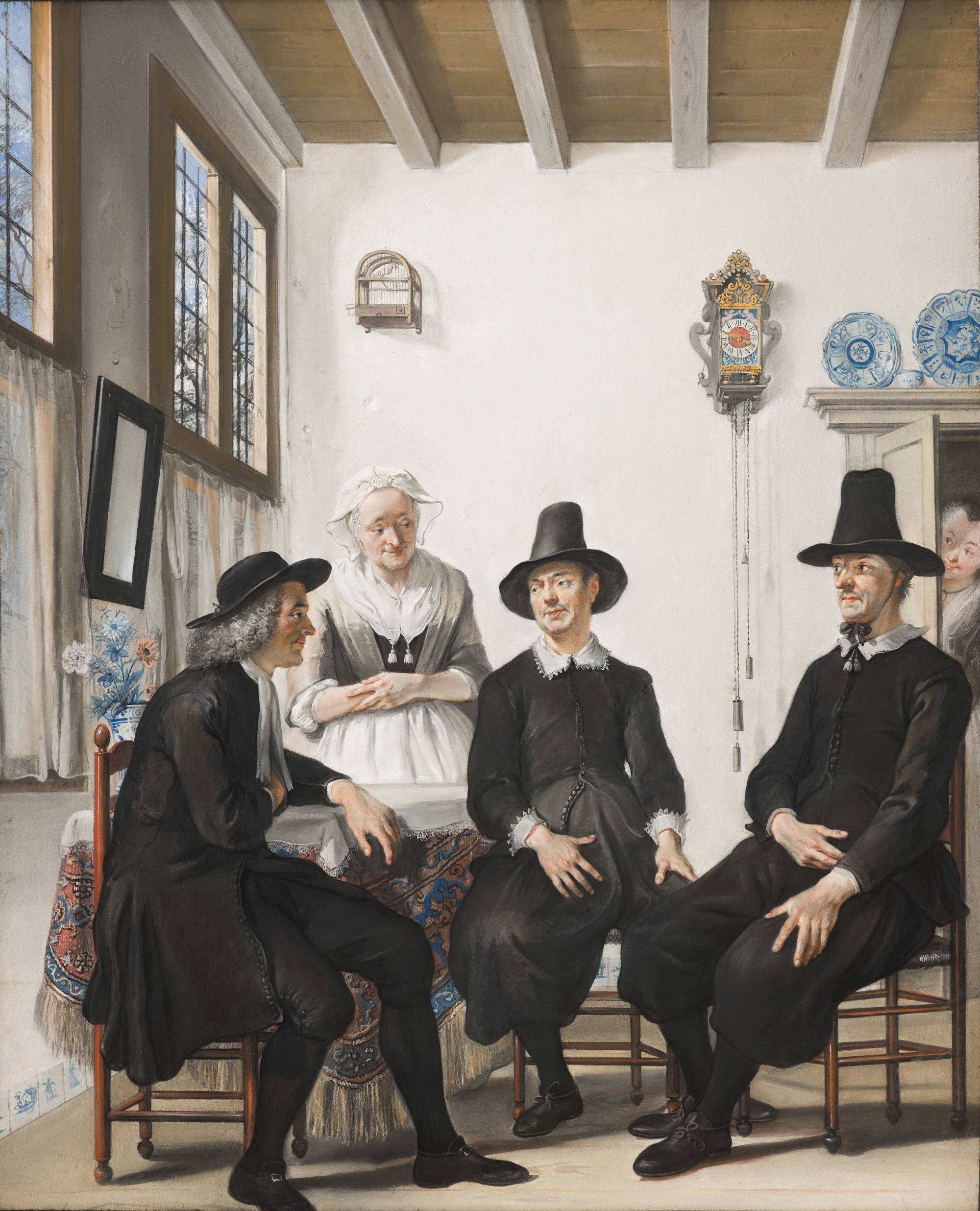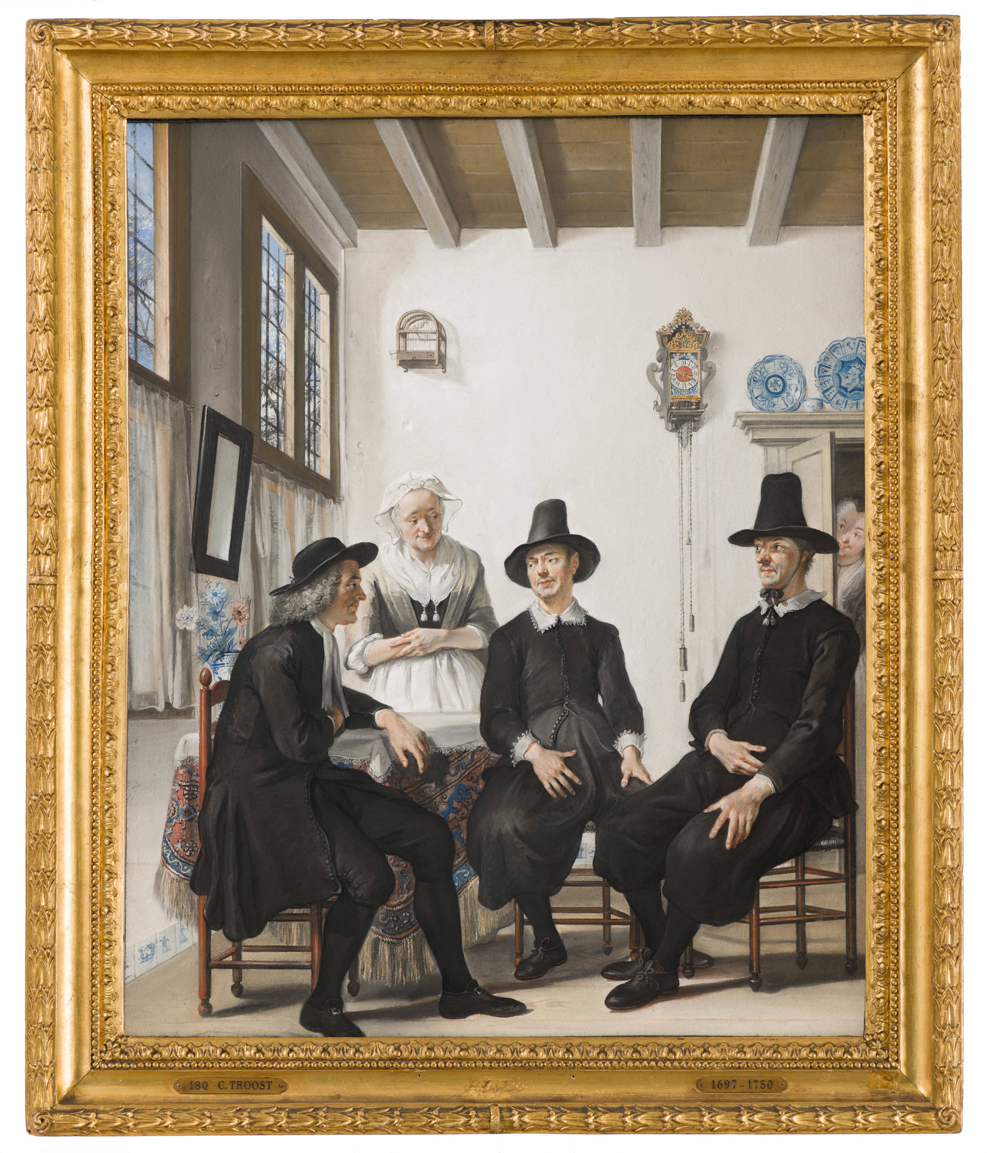 Here we see Jan Jasperzen (on the left, wearing a grey wig) and his wife Dieuwertje receiving a visit from two straight-laced gentlemen whose appearance is decidedly old-fashioned. The men have called in on behalf of Reinier Adriaansz to ask for the hand in marriage of Jan and Dieuwertje’s daughter, Saartje Jans. Saartje is secretly listening in – she has very different plans.