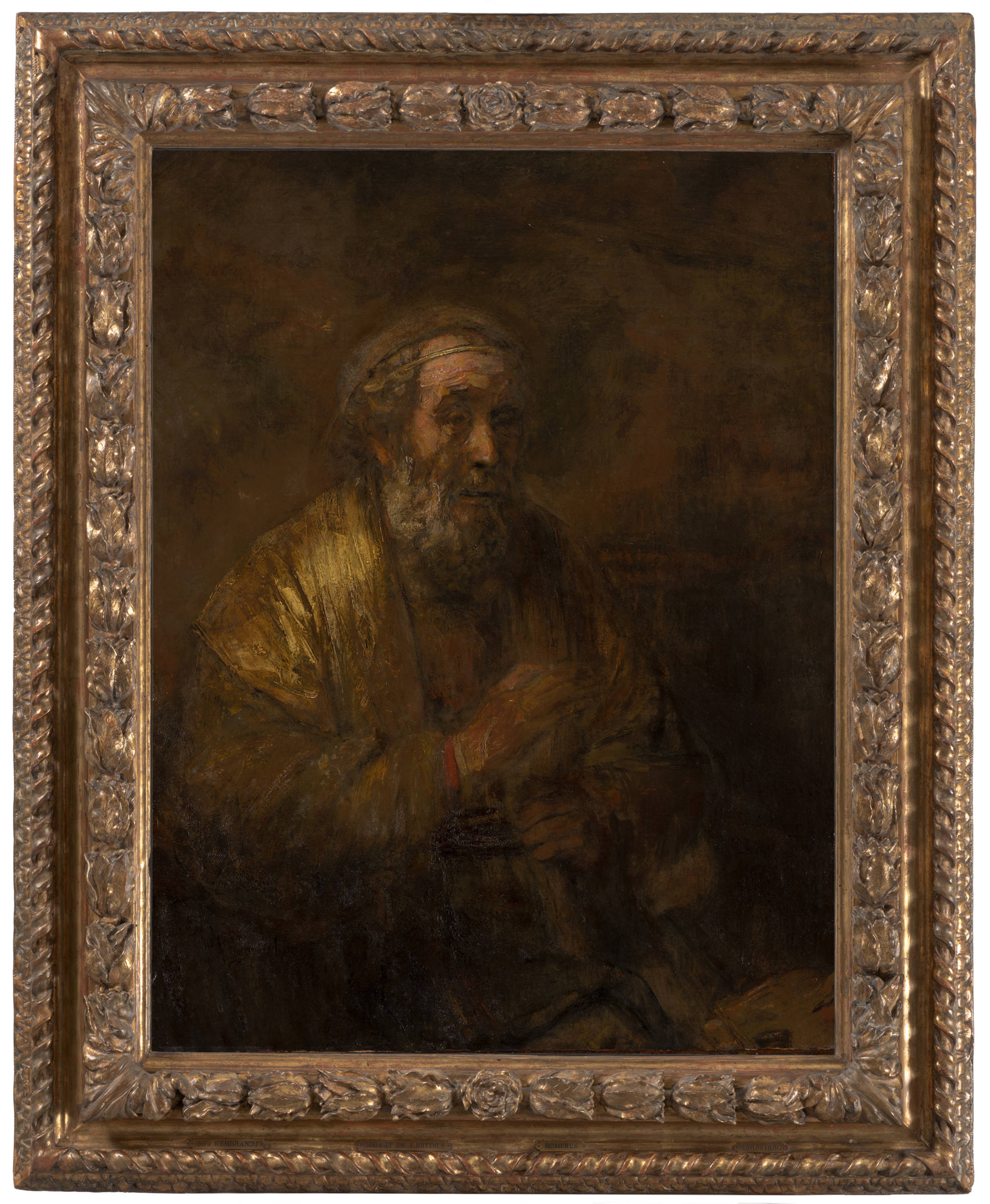 Commissioned by Don Antonio Ruffo, Messina; Ruffo family, Sicily, until c.1750; sale London, Christie's, 16 February 1810, lot 114 (" A School Master with His Pupil, 32" 11); Sir Abraham Hume (1749-18380, Ashridge Park (catalogue 1824, London, British Museum 7855.i.4, pp. 36-37: "Homer Dictating his poems"); S.T. Smith Gallery, London, 1885; T. Humphrey Ward & Son Gallery, London, 1894; Abraham Bredius, The Hague, 1894-1946 (on long-term loan to the Mauritshuis since 1894); bequest of Abraham Bredius, 1946