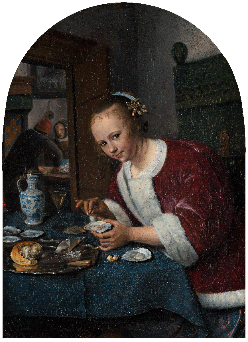 Steen war ein Meister der feinen, sehr detaillierten Malerei der Leidener „Feinmaler“. Weicher Samt, flauschiges Fell, Spiegelungen in glänzendem Silber, nasse Austern – sie alle sehen so echt aus, ohne dass ein einziger Pinselstrich zu sehen ist. Sie scheinen alle mit großer Sorgfalt gemalt worden zu sein, aber das ist nicht immer so. Steen erzielte den Glanz auf Satin zum Beispiel mit nur wenigen schnellen Pinselstrichen.