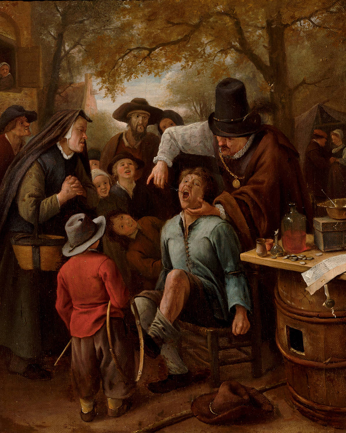 In Steens frühen Gemälden sind es hauptsächlich arme Bauern, die von „Quacksalbern“ oder falschen Ärzten und Zahnziehern ausgetrickst werden. Die „Ärzte“ in seinem späteren Werk haben in der Regel wohlhabende Patienten.