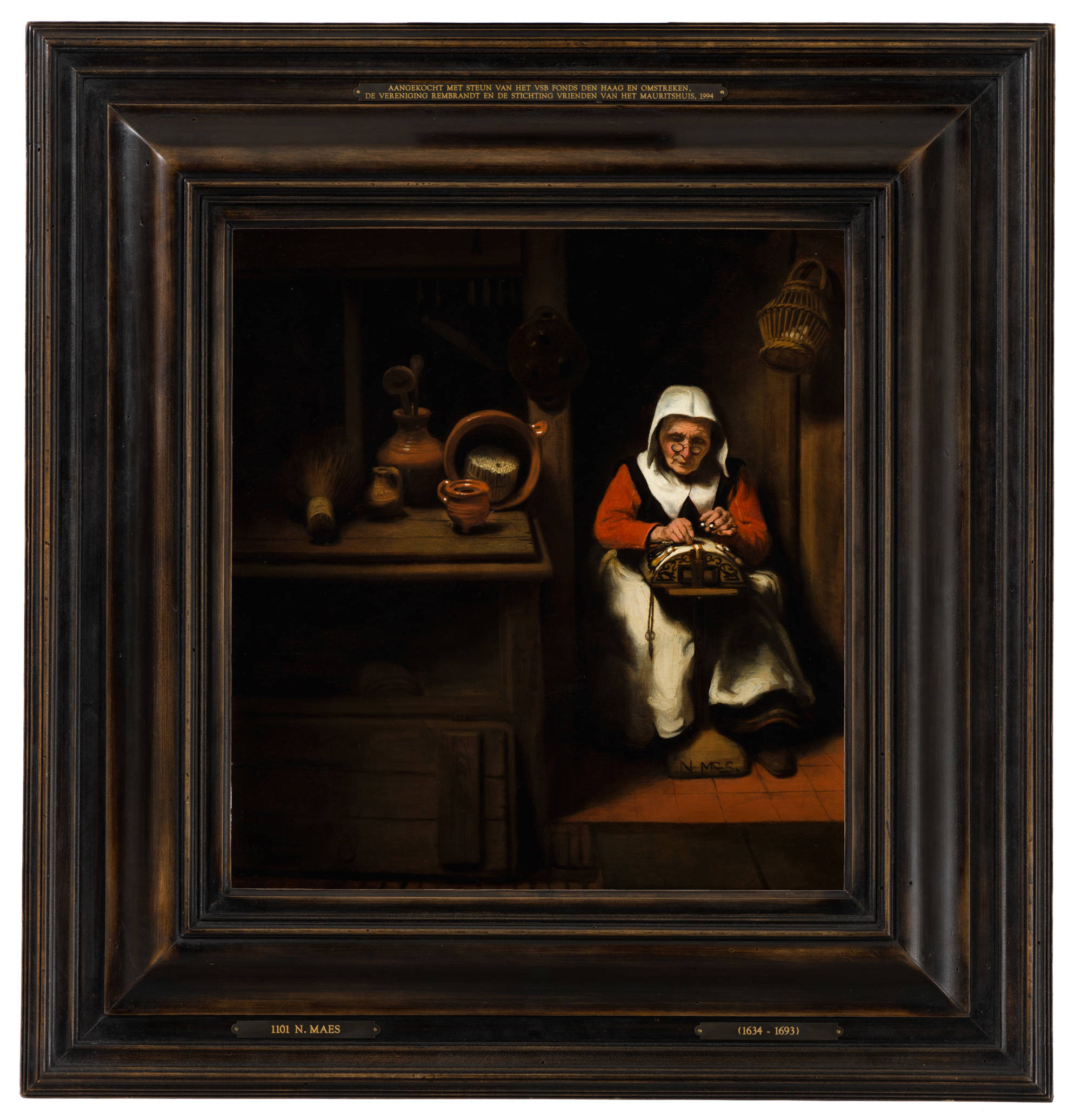 The small painting exudes an intimate, tranquil atmosphere. This is partly due to Nicolaes Maes’ use of subdued colours (brown, red, black and white) and the subtle lighting in the dark room.