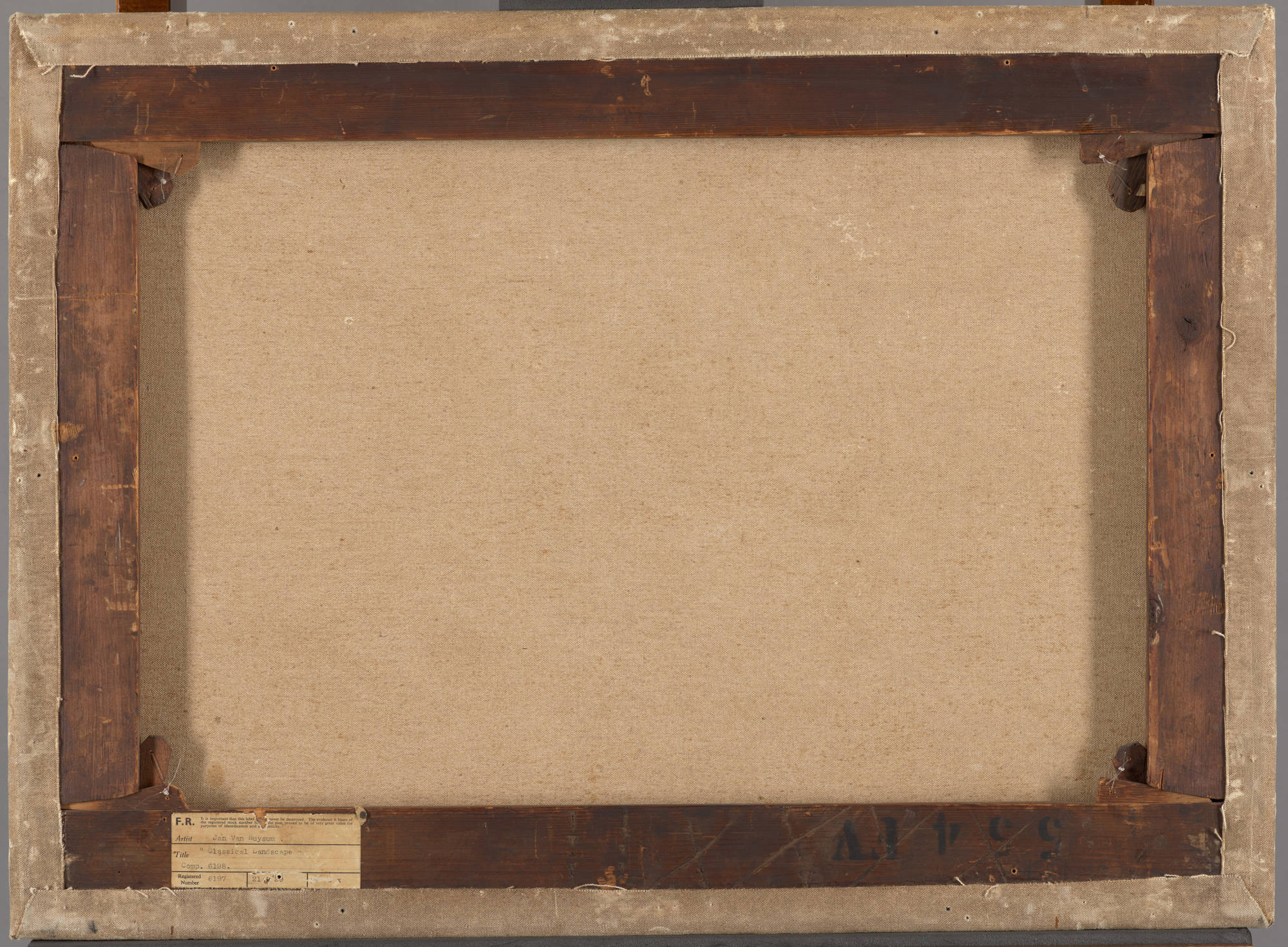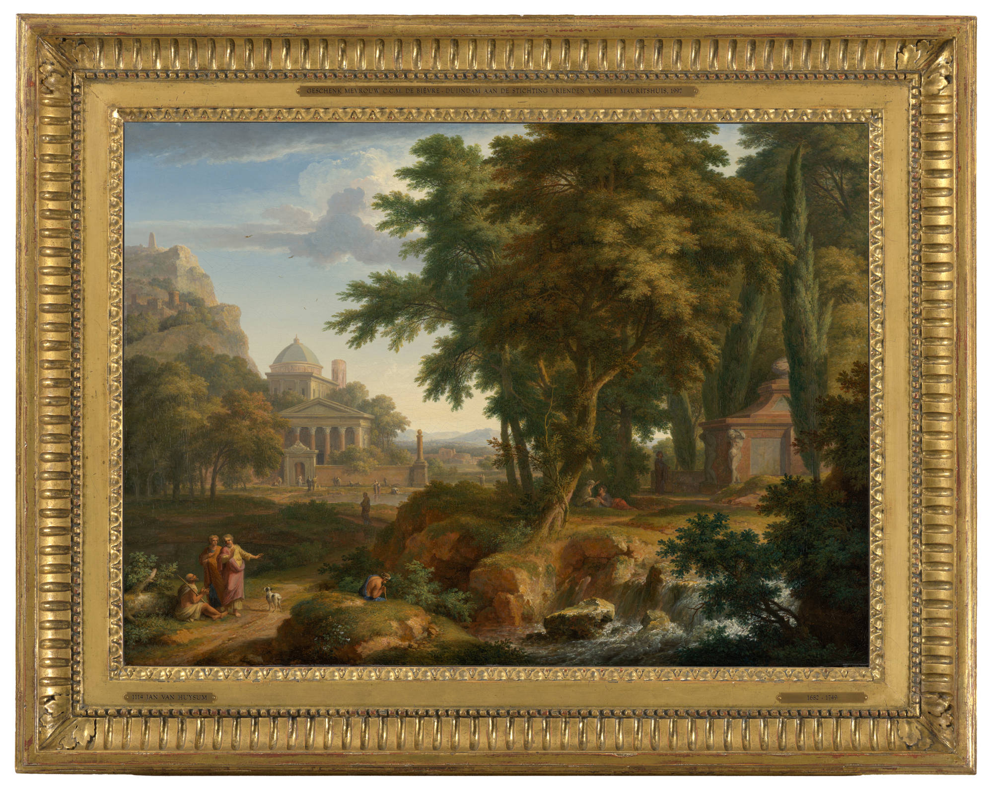 Van Huysum specialised in still-lifes, but he also painted this type of landscape. This work belongs with another painting showing a similar idealised world that is reminiscent of Italy.