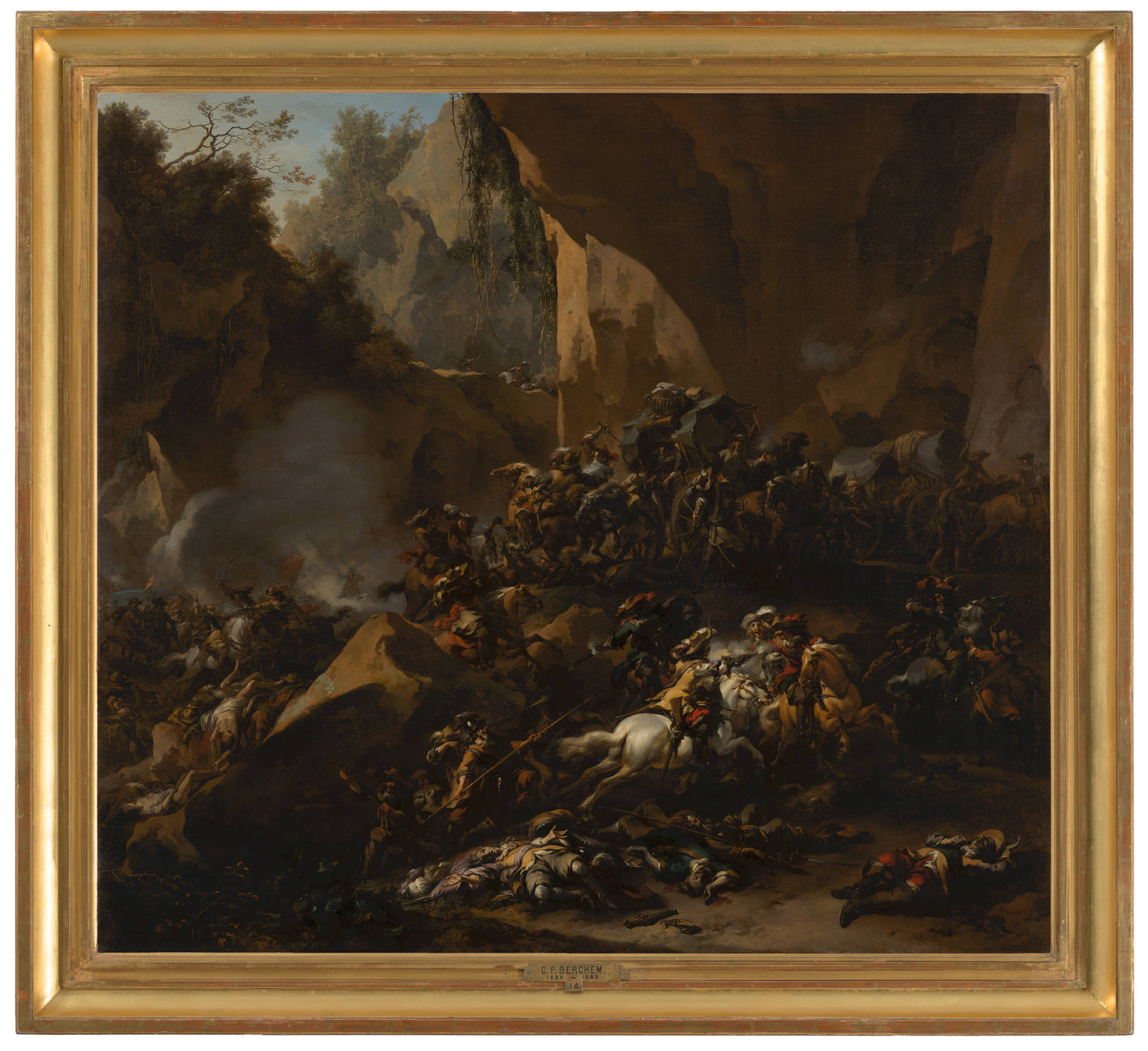 In the mountains, a convoy of horses, carriages and armed escorts is attacked by a band of brigands. Shots are fired, and victims fall. There is a wild flurry of figures and horses. The steep, jagged rocks lend extra drama to the scene.
