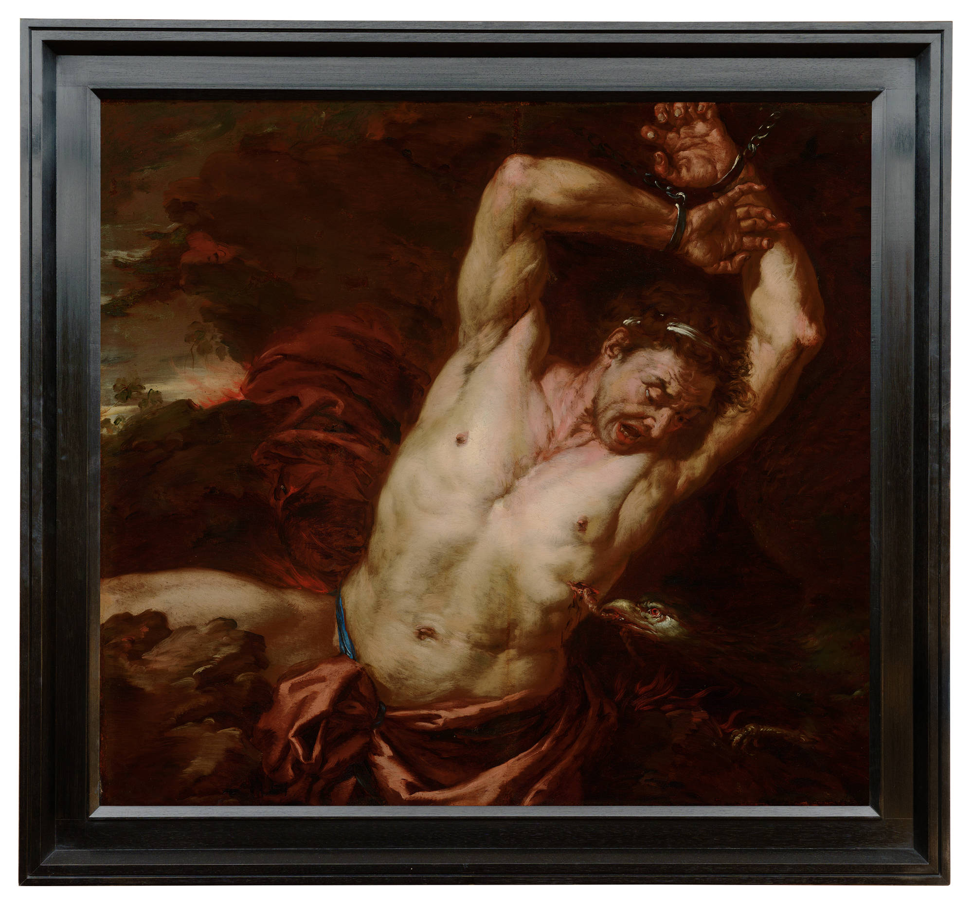 The Italian baroque paintings of Langetti and Zanchi make a fine pair. Not only do they have similar formats, painting styles and pronounced contrasts between areas of light and shade, but their subject matters have much in common too: both feature mythological male figures condemned to centuries of punishment. One shows Tityus, whose liver was eternally pecked at by a vulture. The other shows Sisyphus, who was forced to roll a stone up a hill for eternity, only to watch it roll back down again whenever he neared the top.
