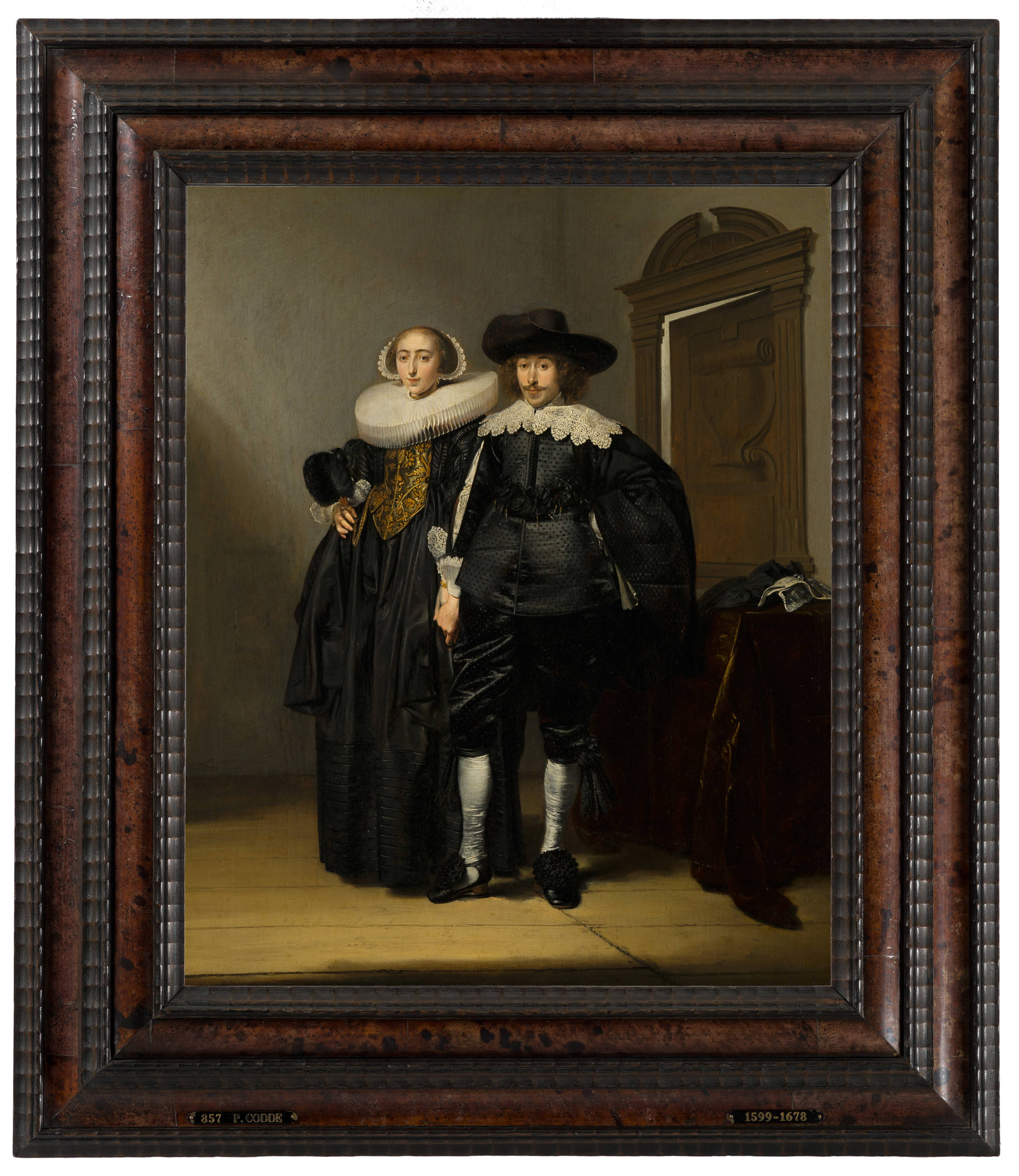 Pieter Codde usually painted sophisticated gatherings in rather spartan interiors. Here he applied that same formula to his full-length portrait of a young husband and wife. They stand close to one another, hand in hand, and are most likely only recently married. They wear their finest outfits with fashionable collars and expensive jewels. Codde captured the opulence of their clothing in meticulous detail, right down to the wedding ring on the woman’s index finger.