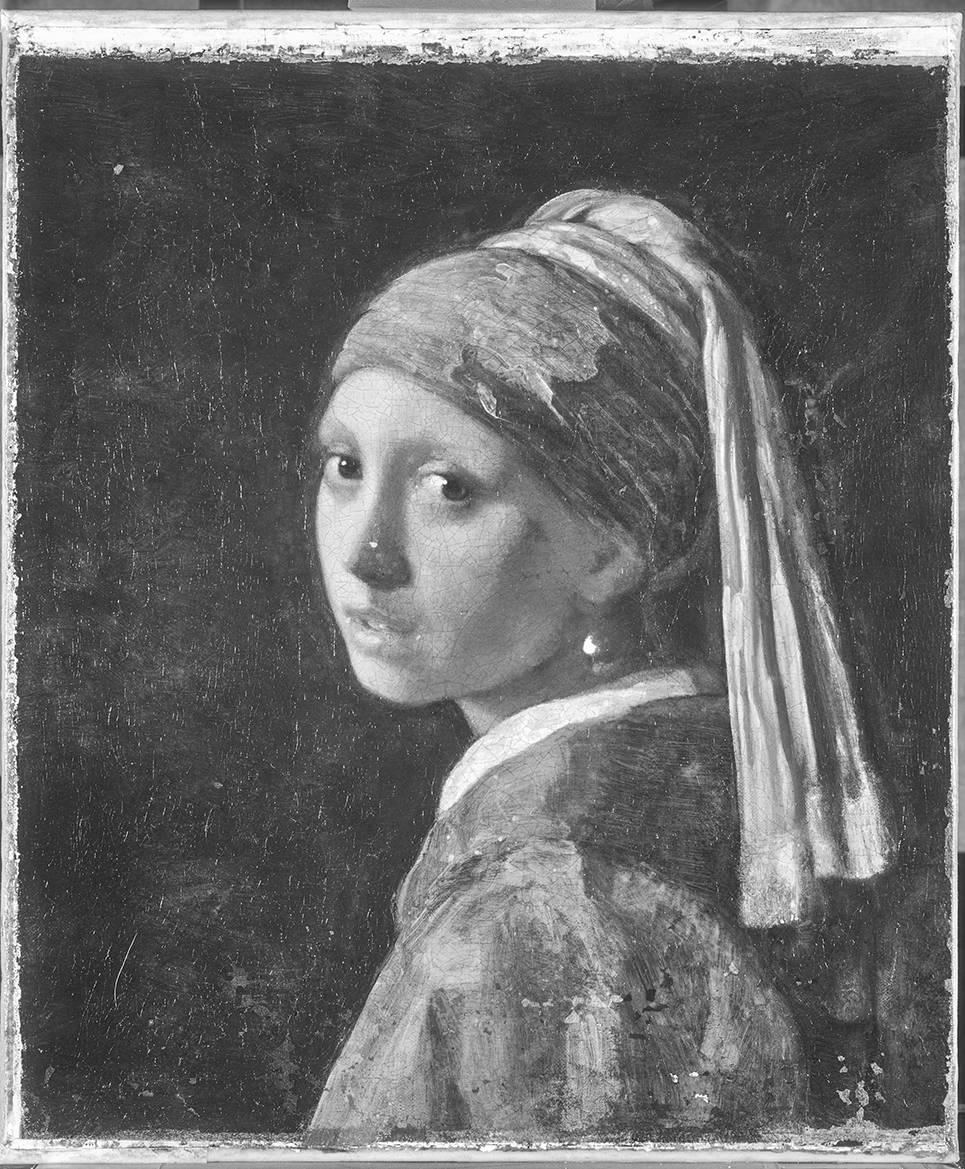 Paint that contains a lot of lead white are also x-ray opaque: her eyes, the highlight on the pearl, her shirt, the highlights in her headscarf, and the left side of her face. The Girl’s face contains a lot of lead white where she faces the light. This creates a strong contrast between the lit and shadow areas, which reinforces its 3-dimensionality.