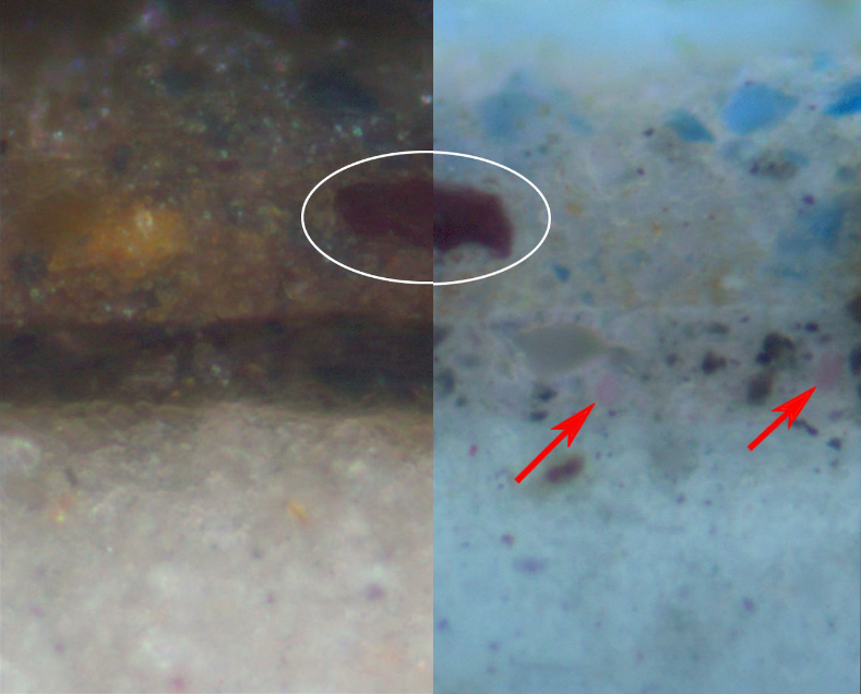 In cross-sections from the Girl, red lake is sometimes visible as particles that appear deep red in normal light, and fluoresce bright pink in UV. Because red lake fades over time, it is harder to see some of the particles. Calcium from the substrate can be detected using SEM-EDX. Paint fragments from the Girl’s skin and clothing were examined with the chromatographic technique UHPLC. They were found to contain carmine, most likely made from Mexican cochineal.
