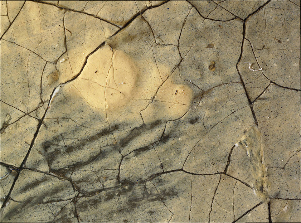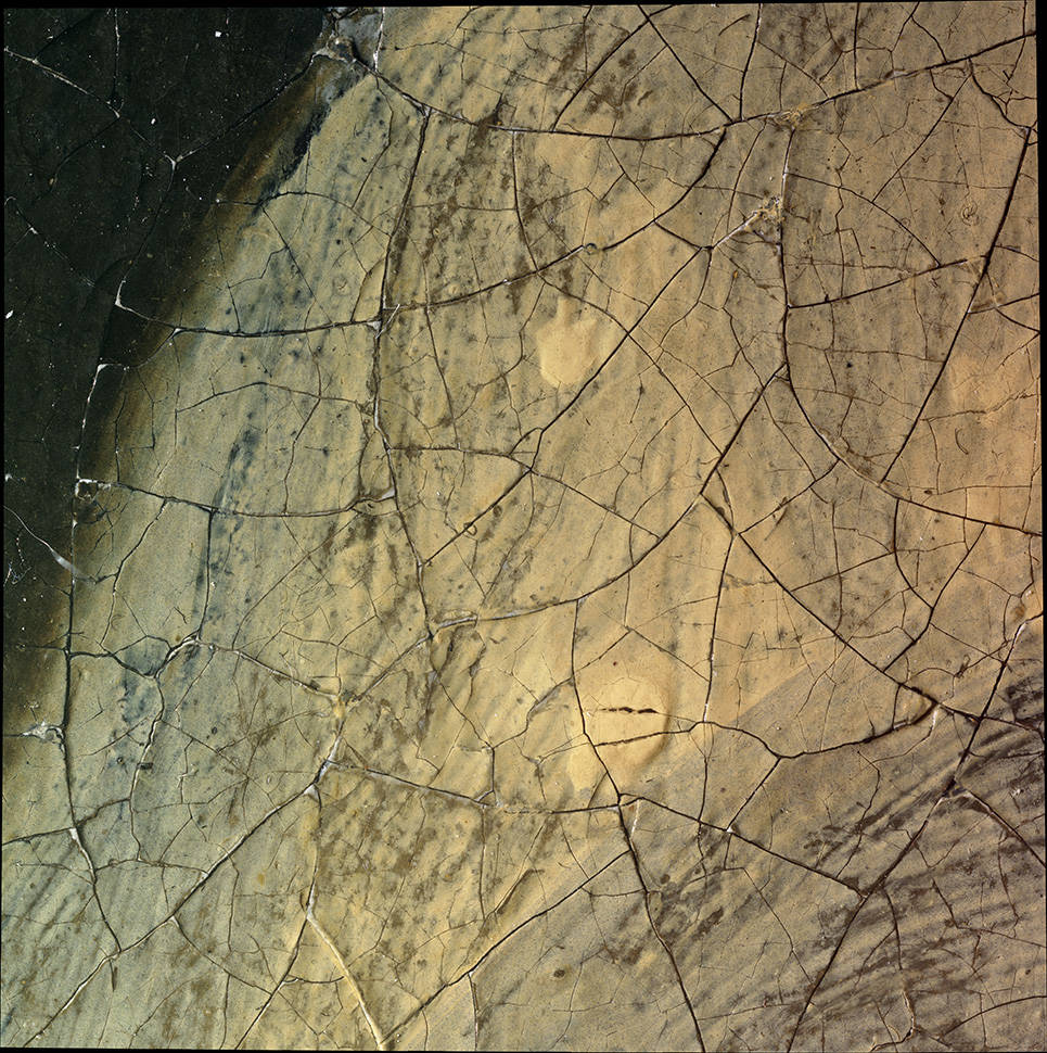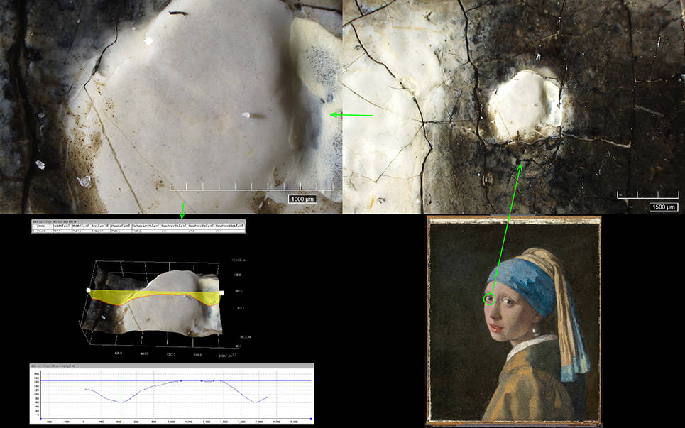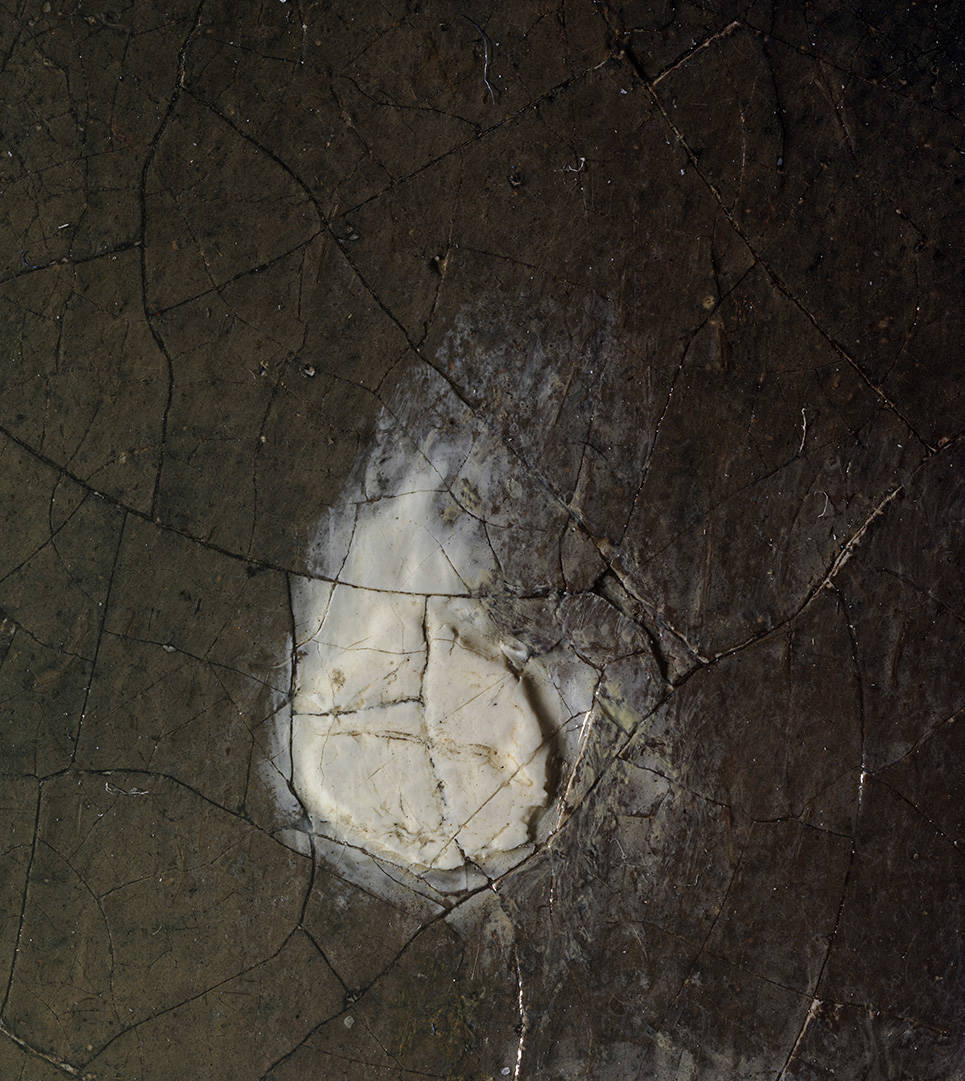 At high magnification, you can see that Vermeer painted the pearl with only a few brushstrokes of lead white. On top of the shadow of the Girl’s neck, he applied a thin grey scumble to lay in the shape of the pearl. He applied lead white more thickly to make the crisp droplet-shaped highlight towards the top.