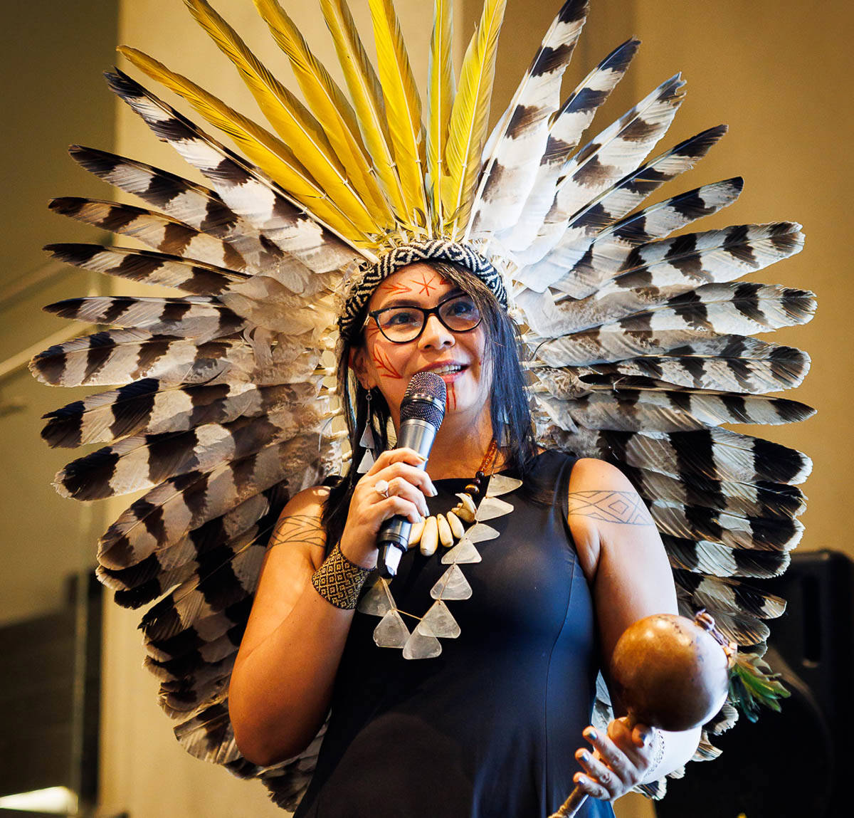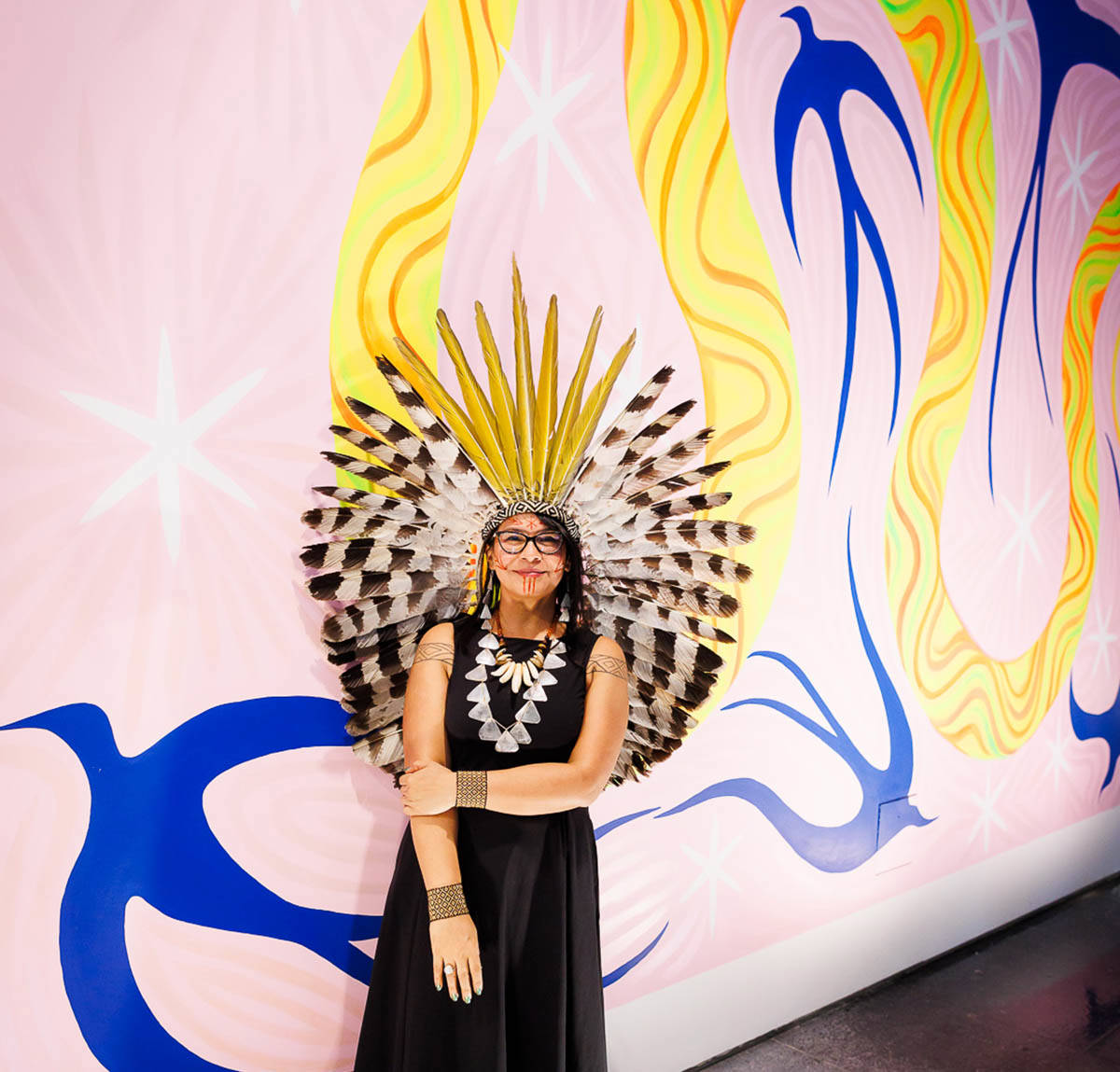 Daiara Tukano, full name: Daiara Hori Figueroa Sampaio - Duhigiô, from the indigenous Tukano people of Brazil, was born in São Paulo. Daiara studied Visual Arts and completed a master's degree in Human Rights at The University of Brasília. Tukano’s work explores the culture, history, and traditional spirituality of her people, combined with family. In addition to her work as an artist, she is also an activist, educator, and communicator.