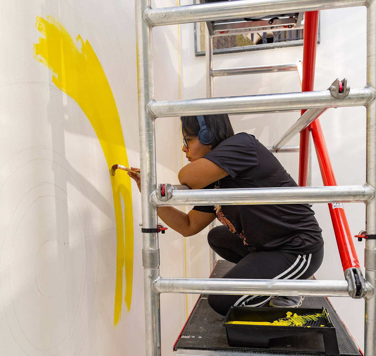 Daiara Tukano made several sketches for this mural, from which the museum staff could choose. However, this is not how she usually works. "The proces is very personal and each time is different. There is not one way to work." She normally does not plan beforehand she says. Normally, she creates freehand sketches directly on the wall with a pencil, which she did this time as well.