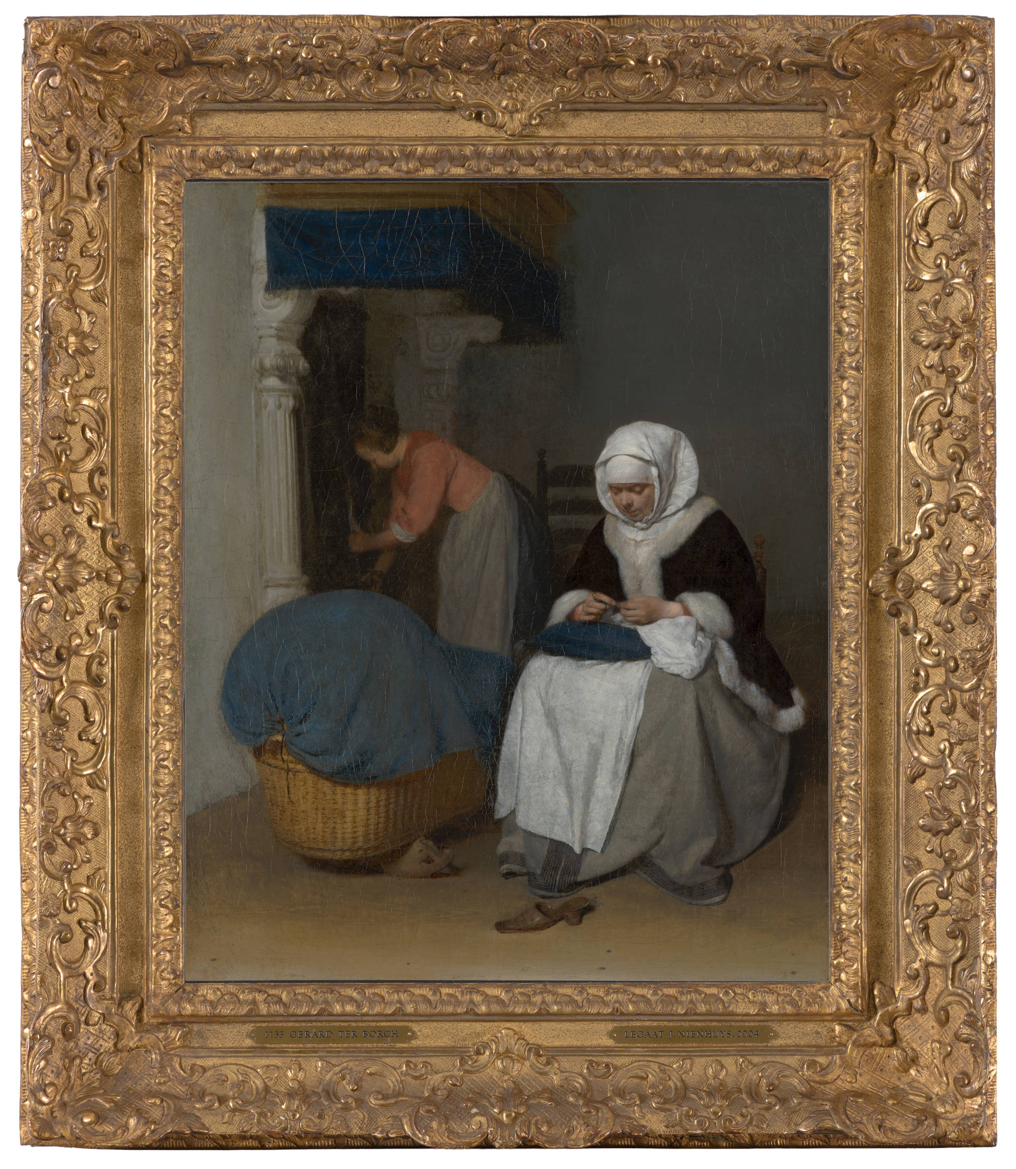 The lady of the house is absorbed in the delicate needlework in her lap. She rests her hands on a dark blue sewing cushion and wears a thimble on her finger. The servant girl in the background is busy with her own chores, while the baby lies sleeping in the covered cradle.
