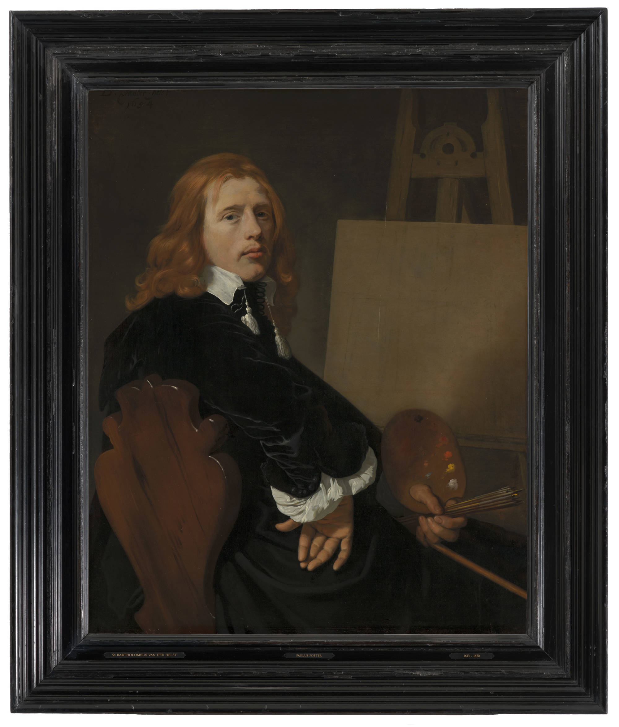 Paulus Potter, the painter of the famous bull, only lived until the age of 28. Shortly after his death, Van der Helst painted this tribute to him. His magnificent black cloak, his fashionable wavy hair touching his shoulders and his confident gaze lend him an impressive air.