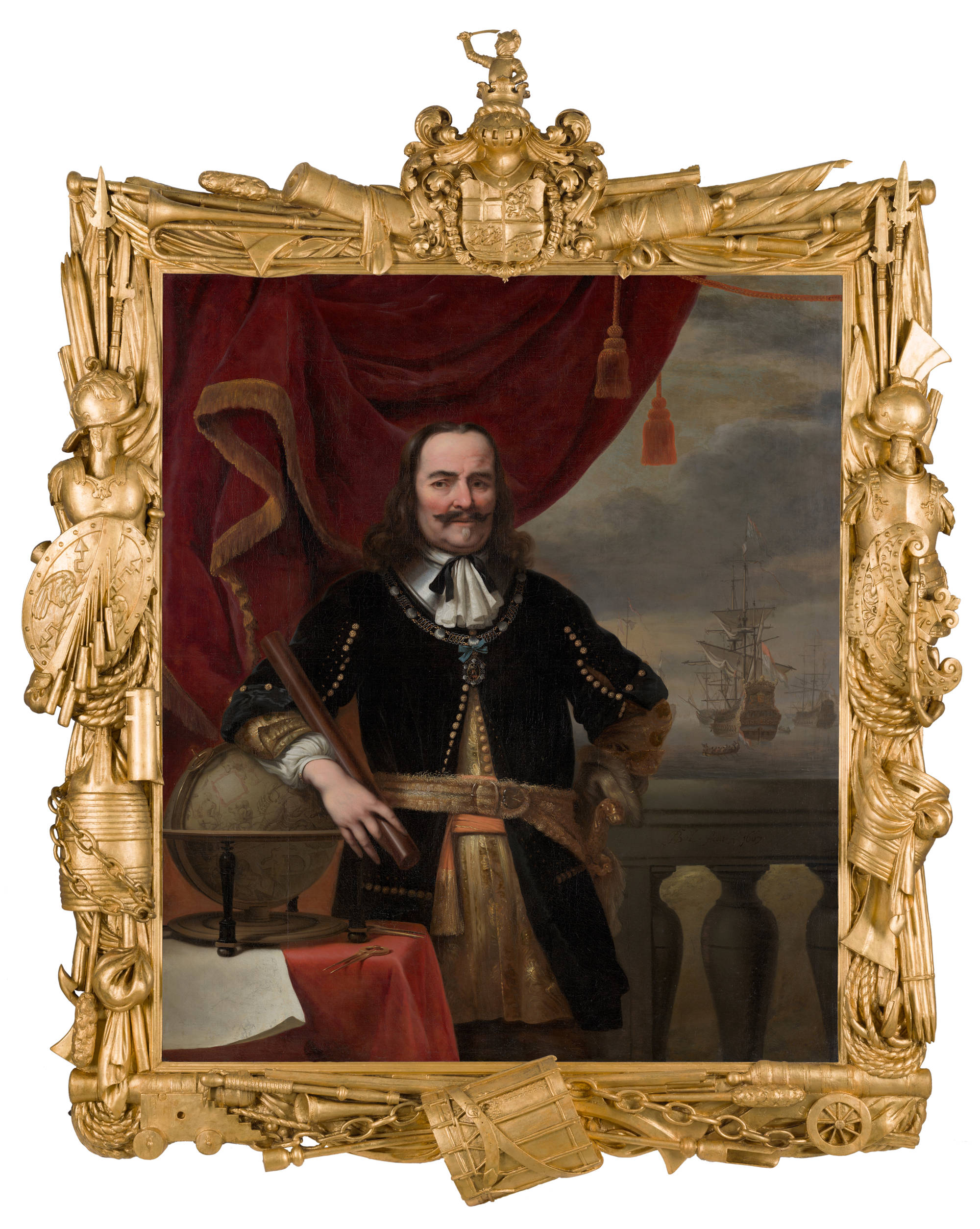 The portrait is still in its original seventeenth-century frame. It is a gilded trophy frame boasting a wonderful collection of weaponry: drums, flags, cannons and powder kegs. De Ruyter’s coat of arms is displayed in the top centre.