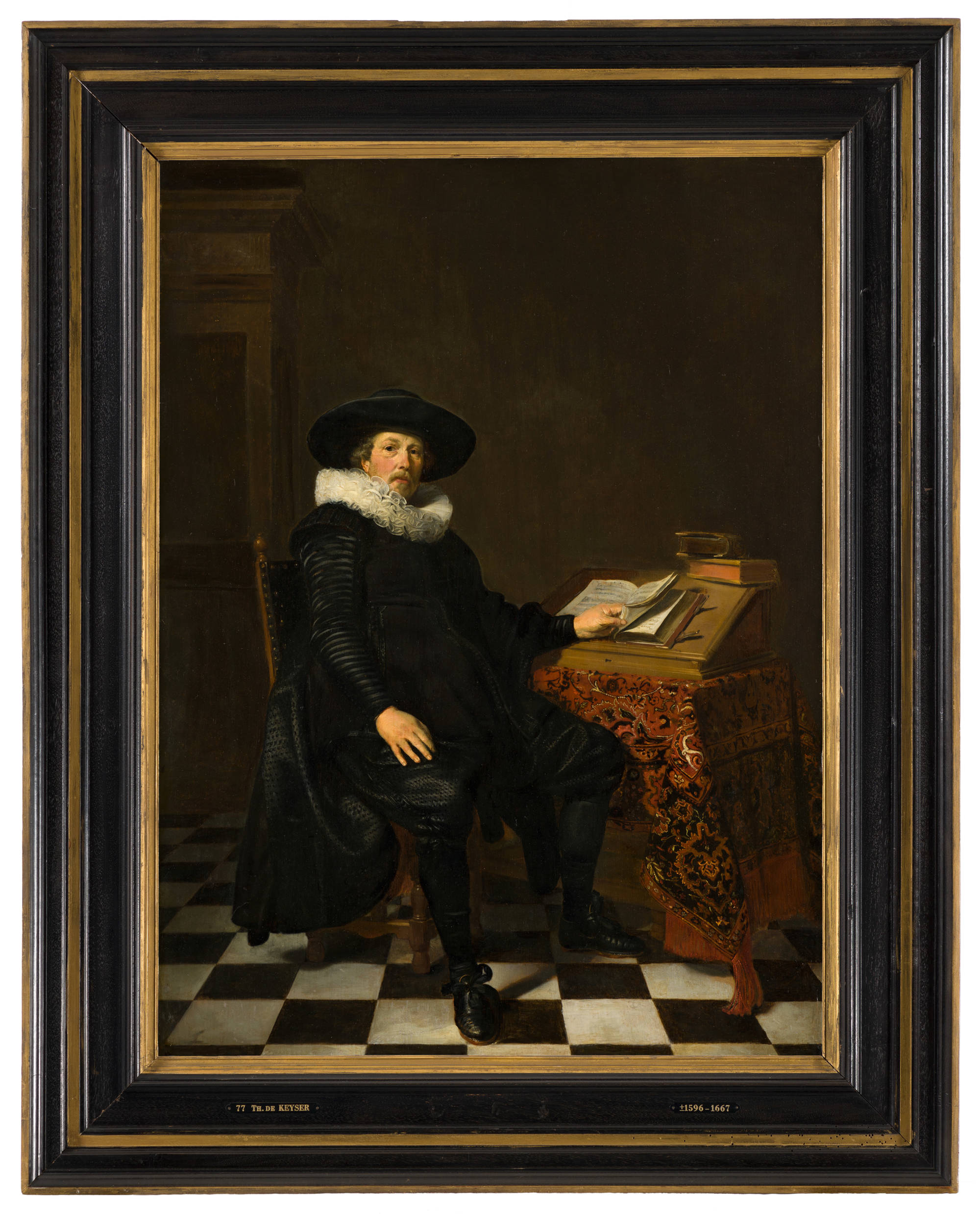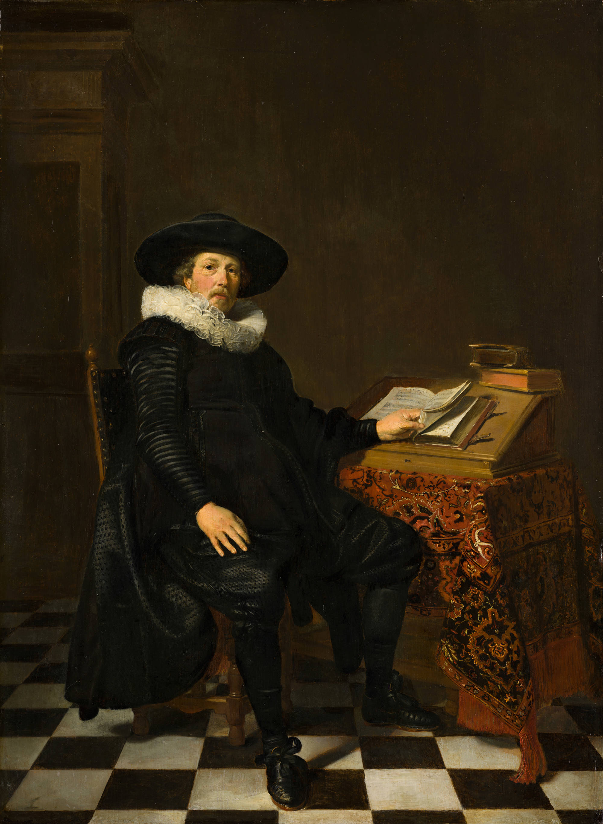 A man in an exquisite black outfit sits in a dark room. Lying on the table is a heavy oriental carpet, with a lectern and some books resting on top. The sitter looks out at us as he browses through one of the books. This gives the impression that we are interrupting his studies and lends the portrait a certain informality.