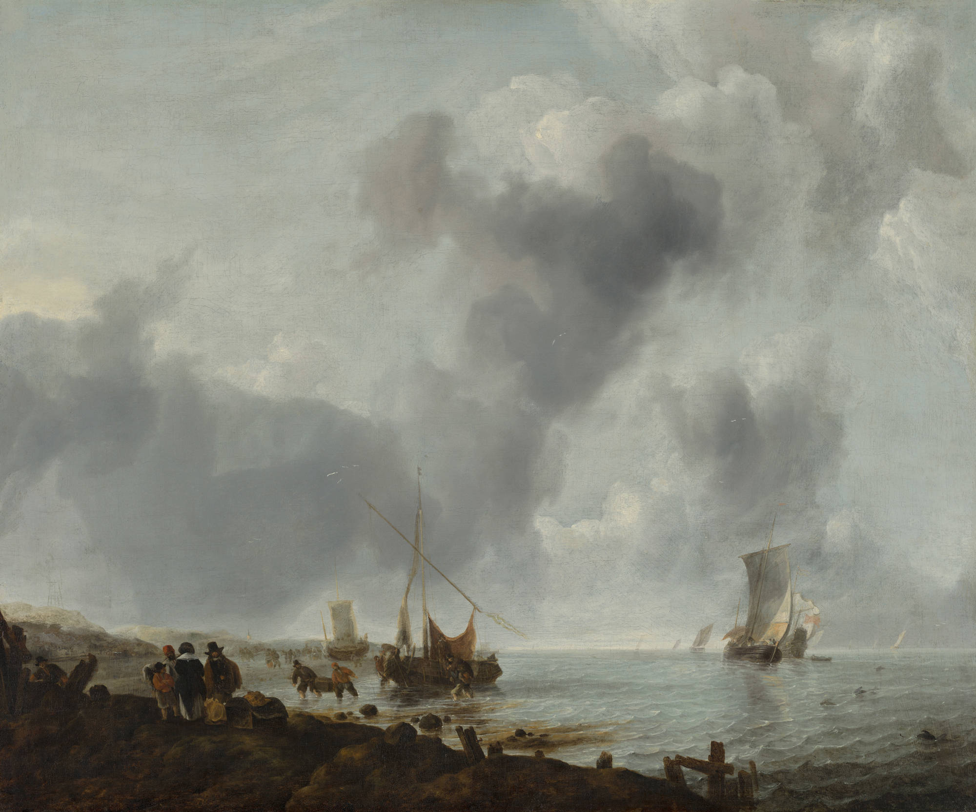 The Amsterdam painter Jan van de Cappelle specialised in seascapes with fishing boats. He often placed the horizon very low, so that there was plenty of space for impressive cloudy skies that determine the atmosphere. That is also the case in this seascape, in which some travellers are being ferried ashore from a ship.