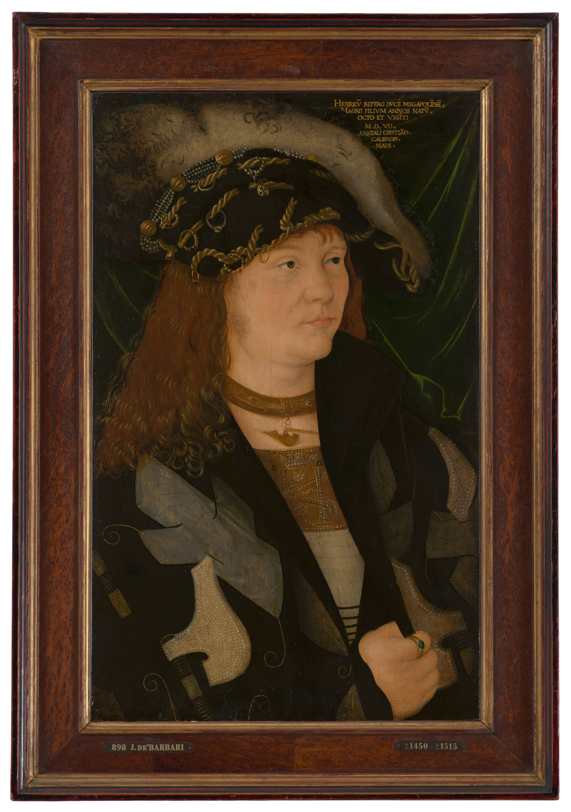 This portrait of the German nobleman Henry of Mecklenburg was painted by the Venetian artist Jacopo de’ Barbari. Henry’s cloak has a pattern of battleaxes and tree trunks. There is also an axe hanging on his chain. Yet Henry’s nickname was ‘the Peaceful’. His hat is decorated with ostrich feathers, strings of pearls and cords with golden rings. Although it looks rather eccentric, Henry’s outfit was the height of fashion among the German nobility of the day.