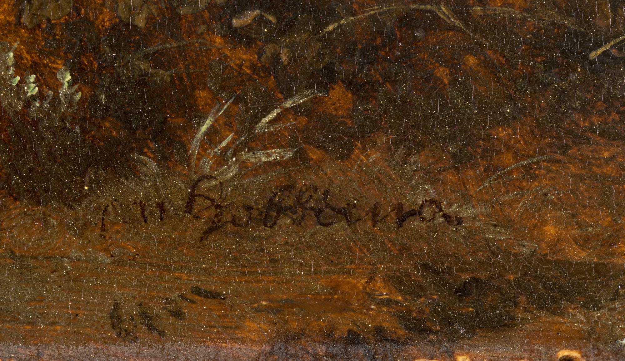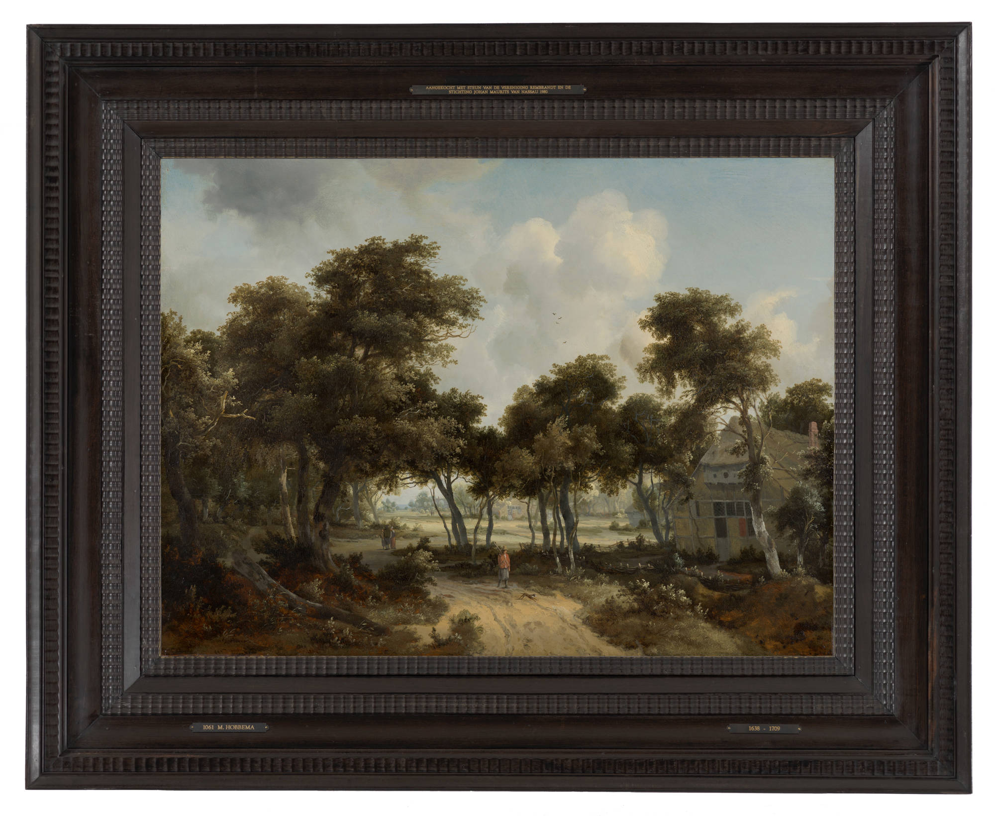 Hobbema’s forest landscape is dominated by impressive tree passages in the foreground and a rickety cottage to the right. The bright background, against which the dark trees stand out, is characteristic of Hobbema’s work. This sunny vista lends great depth and liveliness to the scene. Although Hobbema restricted his palette of colours to green, brown, grey and blue, he used a great variety of these shades.