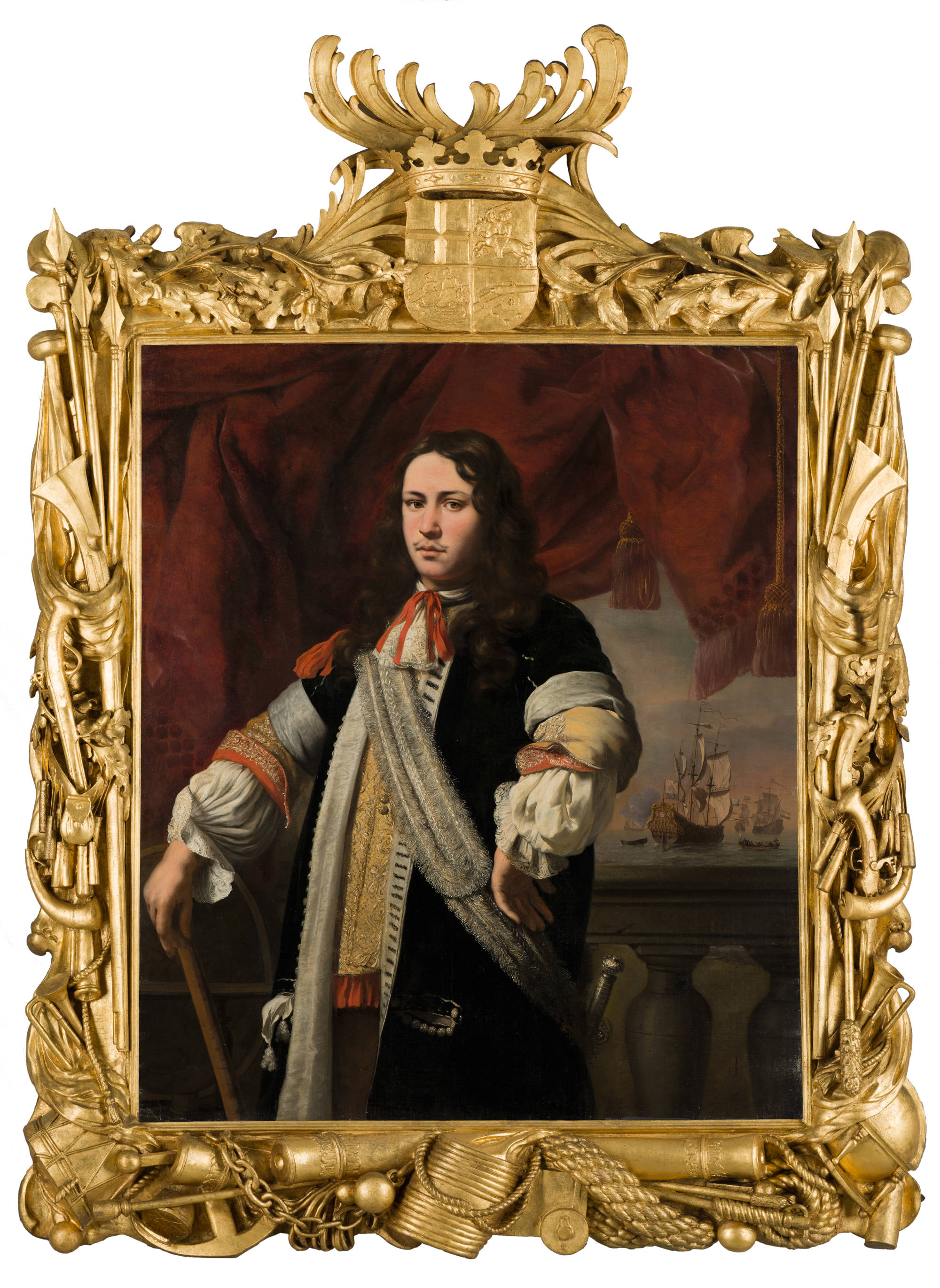 The gilt frame of the painting is original. It is richly decorated with attributes that refer to the navy.