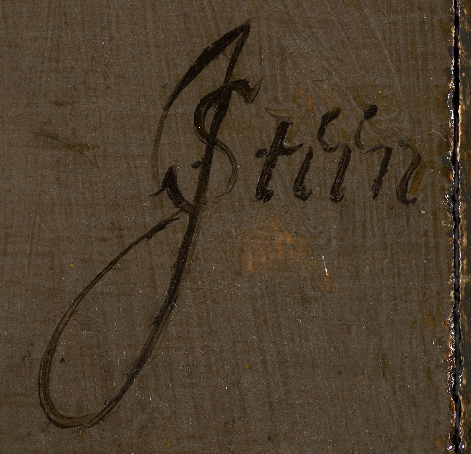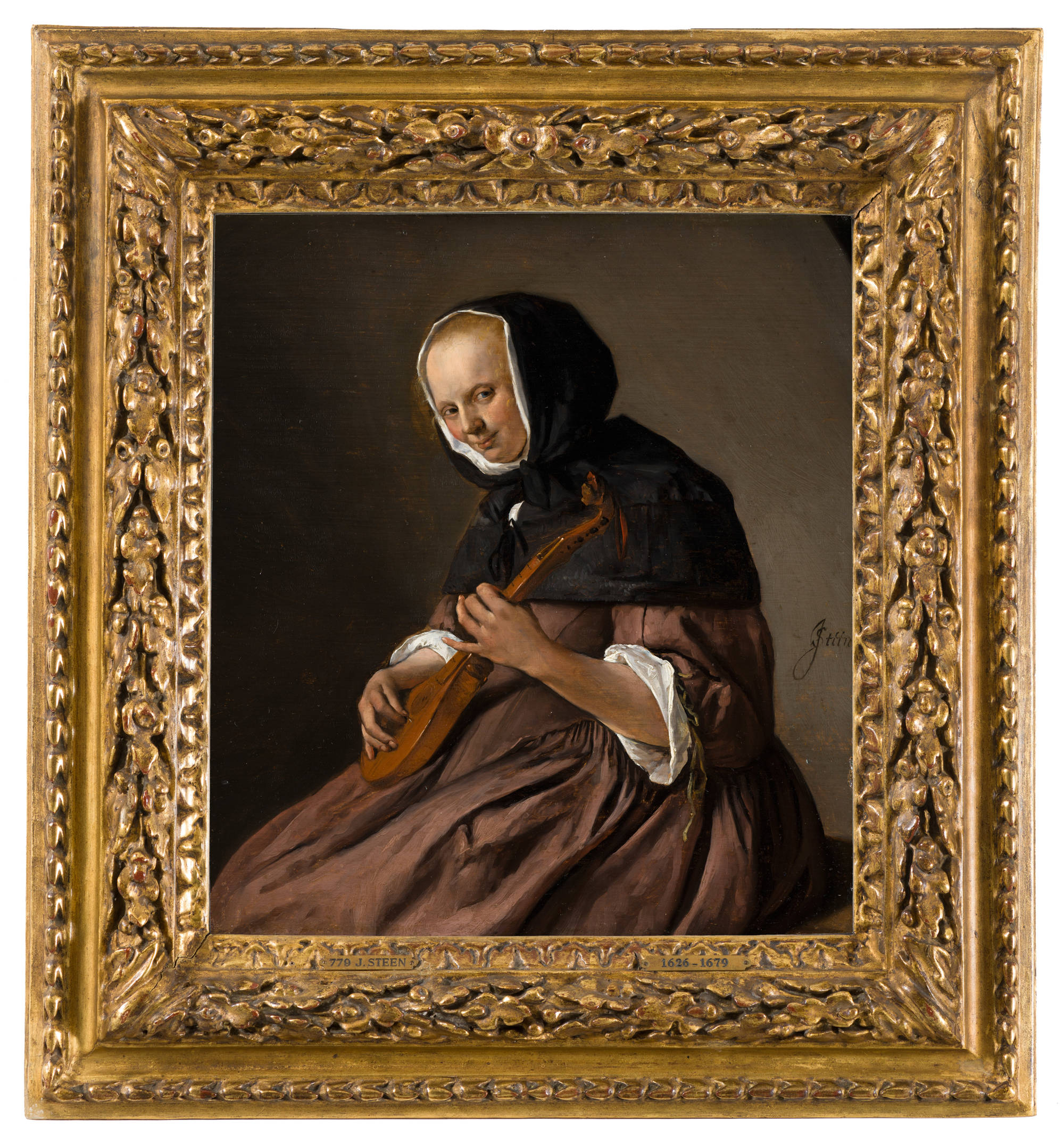 This young woman looks at us from the corner of her eye and smiles with closed lips. Holding the plectrum between the thumb and index finger of her right hand, and with the little finger of her left hand gracefully in the air, she plays her small cittern, a simple stringed instrument that was especially popular among women.1 A bit of the bench on which she sits and casts her shadow is visible at lower right. The background is a uniform grey-brown, which is darker at left, running to a lighter shade at right. This progression contrasts effectively with the figure: the illuminated side stands out against the darker background and her shaded back against the lighter background, where Steen’s elegant signature catches the eye at the height of her upper arm at far right. Otherwise nothing distracts our attention from the woman’s face and her agile fingers. Unusually for Steen, there is almost no extra detail, and this makes such direct contact between the woman and the viewer all the more intriguing.2