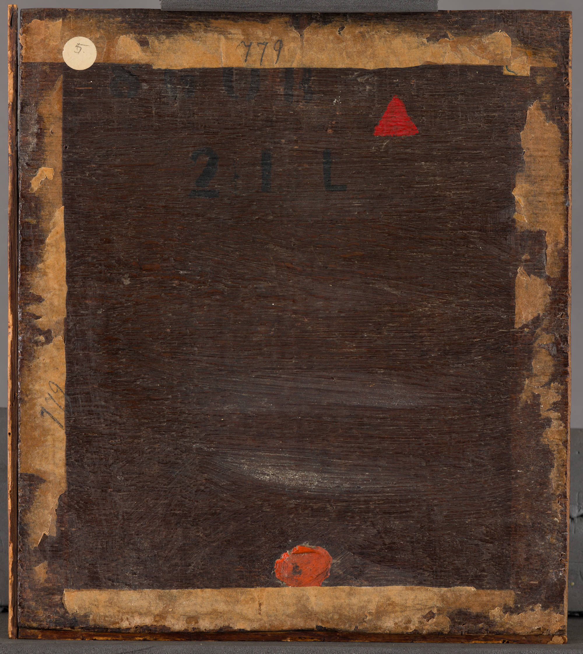 The young woman’s gaze is very similar to that of another halflength figure, the Girl Eating Oysters (see inv. no. 818). Their smiling faces both seem to be based on the same model, a woman with a high forehead, slightly protruding lower lip and rounded chin. In the past, the woman with the cittern was thought to be Steen’s wife, Grietje van Goyen,3 but her features seem more generalised and appear frequently in the artist’s oeuvre.4 Over her pink-brown dress, the woman wears a black fur cape tied with ribbons, which reveals nothing of her neck. The remains of red lake on the pinkbrown colour seem to indicate that the dress originally had a somewhat redder hue. The sleeves of her white undergarment extend from her dress, leaving her lower arms partly uncovered. Loose ribbons hang from her left sleeve. She wears a black scarf, tied beneath her chin, over a white cap from which wisps of ginger hair escape. Steen suggested the colour of her eyes by means of a single stroke of blue in her left eye.