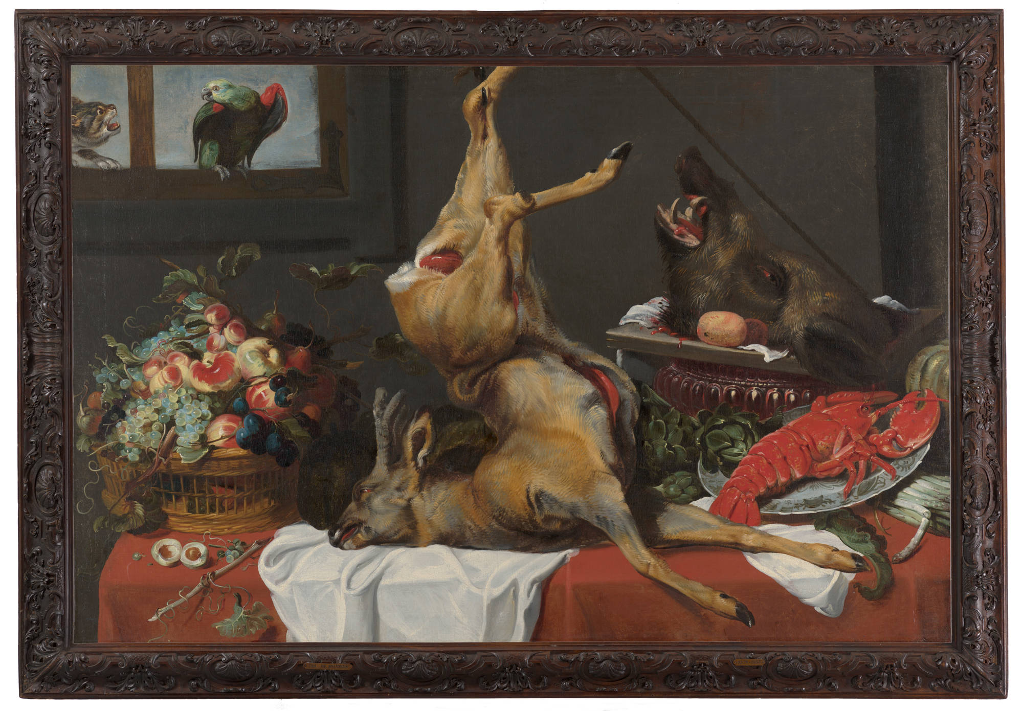 The Flemish artist Frans Snijders specialised in painting both live and dead animals. Here, the head of a wild boar, a large lobster and a dead stag form a lavish still-life, along with the artichokes and the basket filled with fruit.