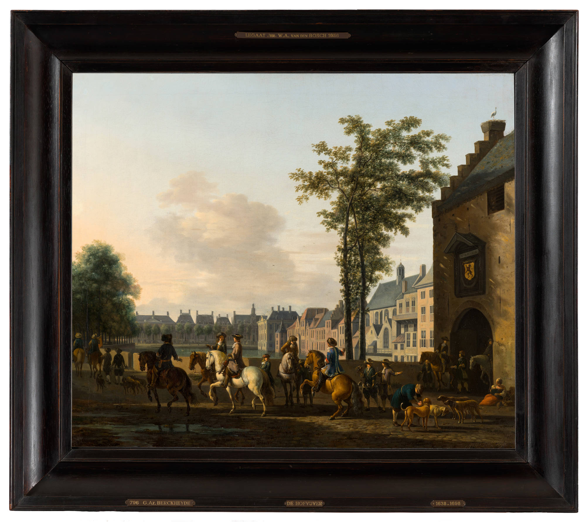 A hunting party is passing through the Gevangenpoort (Prison Gate) alongside the Hofvijver pond in The Hague. These men with their servants, dogs and falcons are members of the Dutch aristocracy. Rain puddles still glisten on the ground, but the sun has now broken through. The sunlight falls on the white horse and the buildings of the Binnenhof. And – in the distance – on the Mauritshuis.