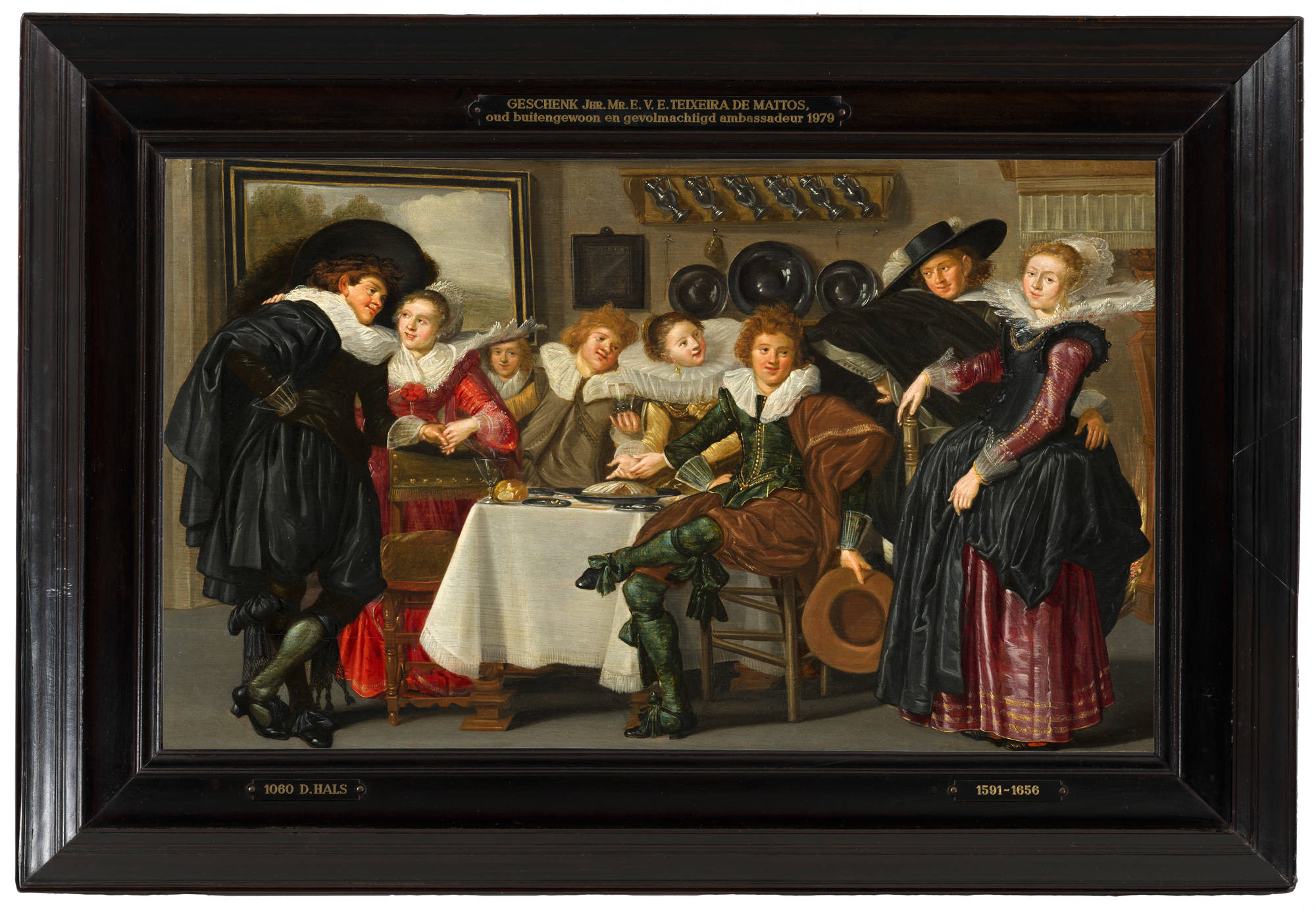 A group of friends has gathered in an interior. They are eating, drinking and flirting with one another. With their fashionable clothing and silk stockings, they are extremely flamboyant, but the painter has made their collars ridiculously wide. The young woman on the right is being enthusiastically greeted by the others in the group. The man alongside her has placed his hand possessively around her waist and exchanges a knowing look with the man standing on the left. A look that seems to say: ‘Hands off, pal’.