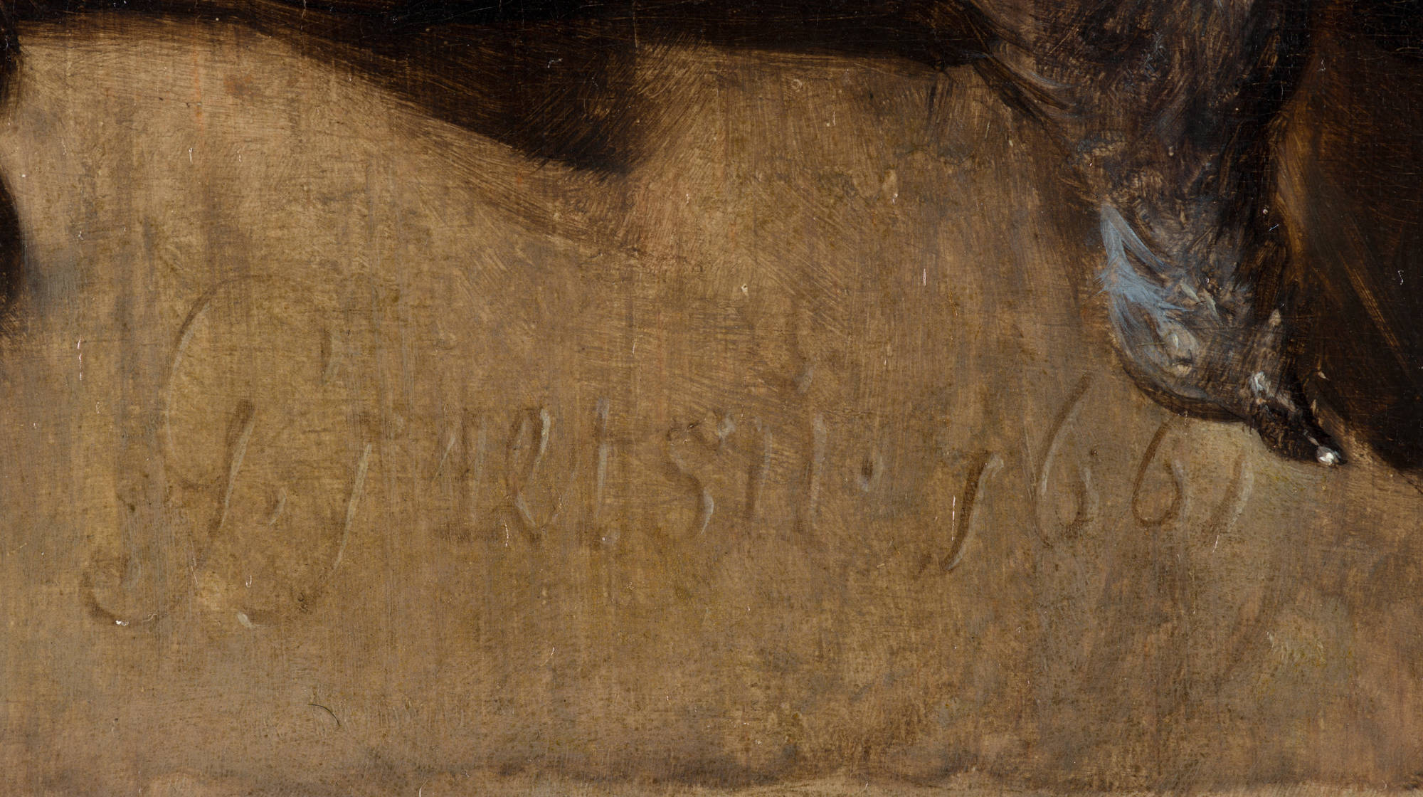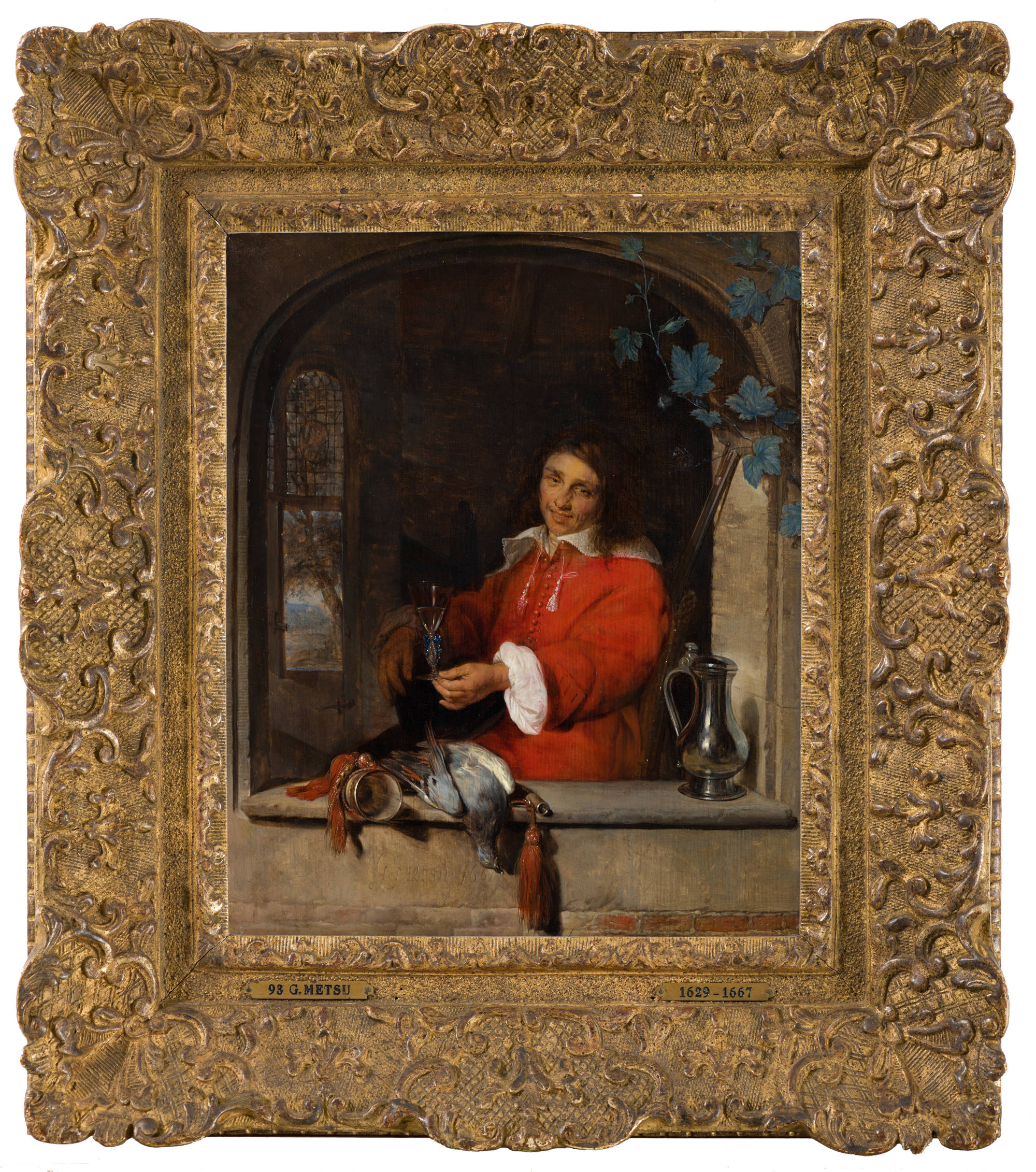 A huntsman in a fine red jacket is sitting at an open window. He is raising his glass and giving us a roguish look. In front of him are the attributes of his work: a hunting horn and a dead pigeon. For Dutch-speaking contemporaries, the puns would have been immediately clear. The words ‘jagen’ (to hunt) and ‘vogelen’ (to catch birds) also referred to courting and making love.