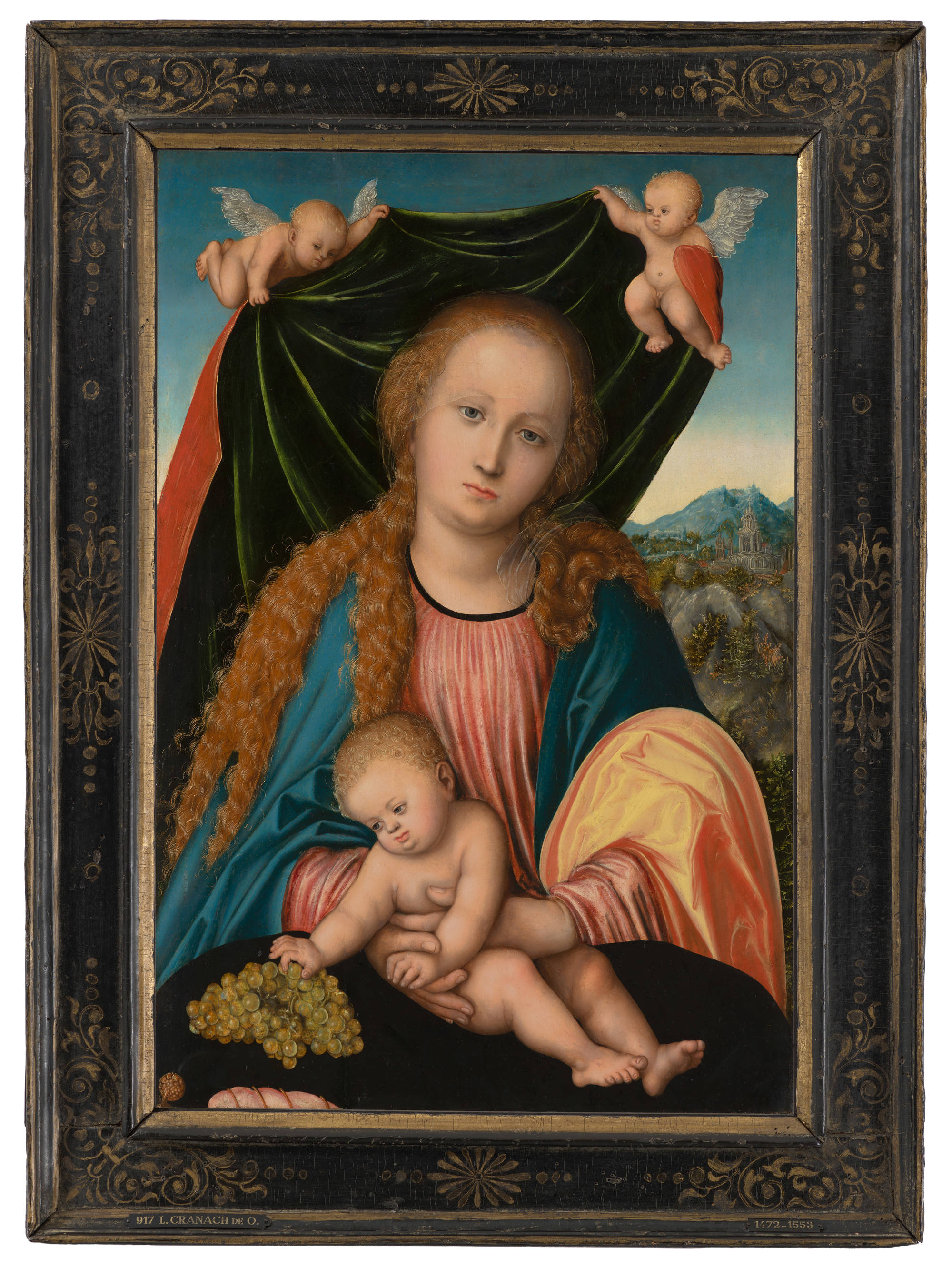 In de middeleeuwen en de renaissance zijn talloze voorstellingen van Maria en haar kind Jezus gemaakt. Deze Madonna is van de Duitser Lucas Cranach. Hij schilderde Maria met een mooi rond, geïdealiseerd gezichtje en lange golvende haren. Ze kijkt wat lijdzaam voor zich uit, terwijl haar kind een druif probeert te plukken – een opvallend speels gebaar. Twee engeltjes houden een kleed omhoog, bij wijze van baldakijn.